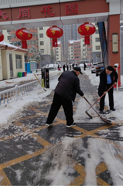 活动中,工作人员和志愿者提前上岗,社区与各物业共同协调除雪物资及人员分配,利用铲车、扫帚、雪锹等除雪工具,有条不紊地清扫辖区的积雪。大家按照各自分工开展除雪工作,及时清理辖区内的主要道路、小区内居民楼前的积雪,确保居民安全通行。