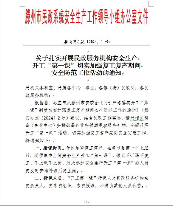 一、结合实际制发通知。市民政局针对养老行业春节轮休的特点,于2月6日提前制发《关于扎实开展民政服务机构安全生产开工“第一课”切实加强复工复产期间安全防范工作活动的通知》(滕民安办发〔2024〕1 号),对授课时间、范围、内容等进行详细规定,为工作开展夯实基础。大年初五,通过将精心整理的学习视频、安全生产标准化资料等提供给民政服务机构,确保学习内容的质量高和丰富多样,并进行相关工作提醒。