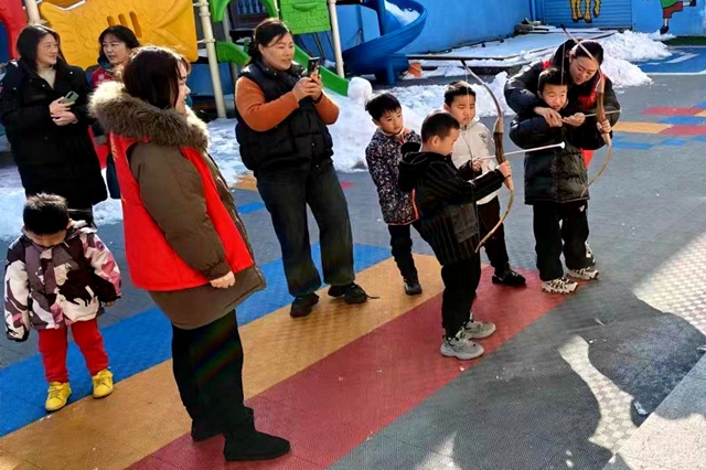 射箭作为儒家“六艺”之一,具有悠久的历史和深厚的文化底蕴。“上弦明月半,激箭流星远。”孩子们在志愿者老师的指导下,摆出酷酷的身姿,配上全神贯注的眼神,举弓,搭箭,瞄准,放箭,全身心释放自己的童年本真,感受着射箭的乐趣与传统的美好。
