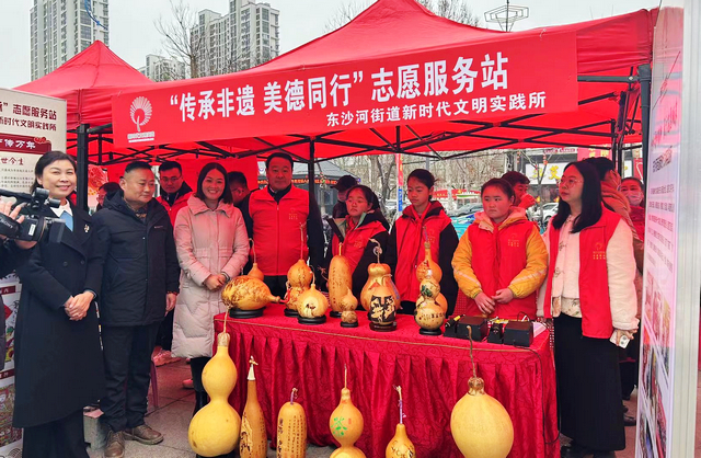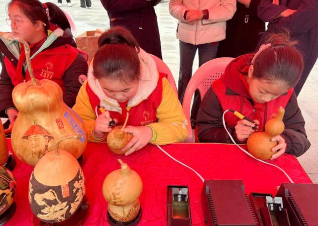街道新时代文明实践所、东沙河中心小学志愿者现场讲解葫芦烙画艺术,志愿者现场进行葫芦烙画,让“烙画葫芦”工艺和葫芦文化能够薪火相传,吸引不少群众驻足观看。