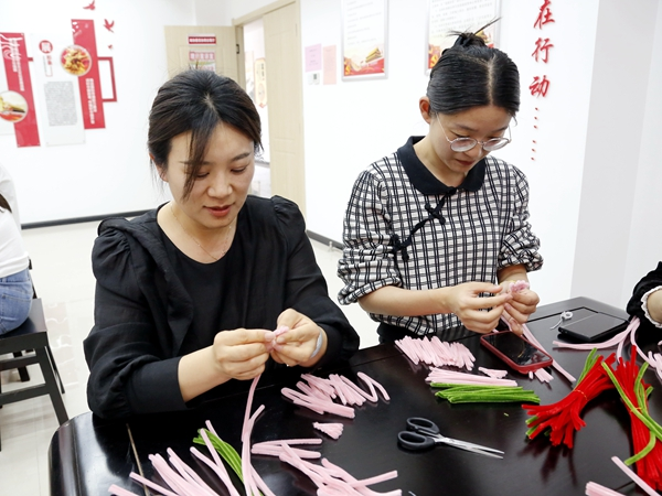 活动开始,志愿者首先向大家展示了扭扭棒的成品花束,清新可爱的扭扭棒手工花引起了大家强烈的兴趣,每个人都跃跃欲试。随后,志愿者介绍了花朵的制作材料及工具,再根据花朵的花瓣、花叶进行一步步讲解。大家跟随讲解步骤,充分发挥想象力,将扭扭棒对折、弯曲,反复调整,扭成一个个花瓣的形状,再由多个花瓣组成一朵花。大家捧着自己的得意之作,脸上洋溢着幸福感与成就感。