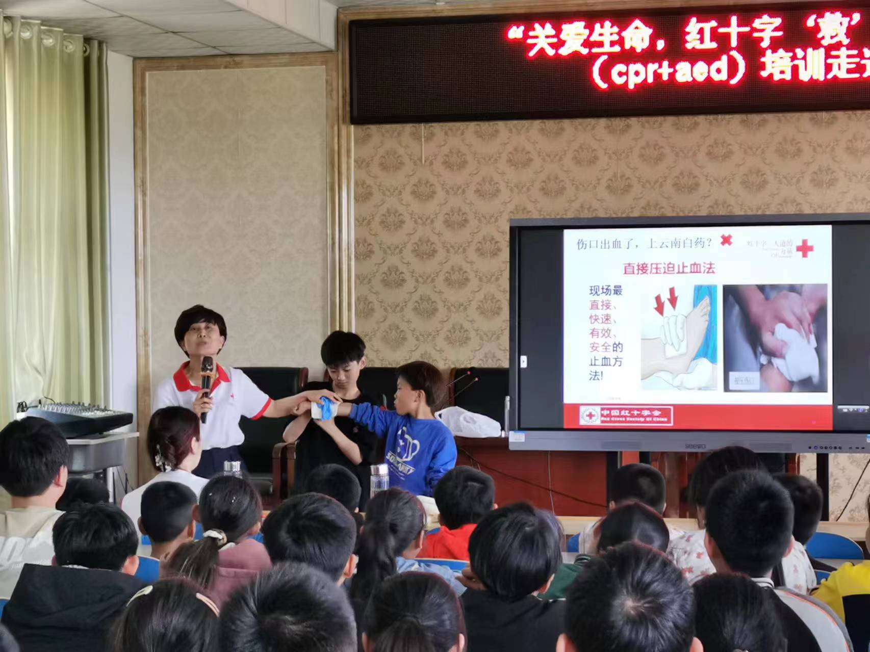 培训邀请到山东省红十字鲁南应急救护培训基地讲师、山东省红十字会优秀师资、兖矿集团“十佳救护师资”、滕州市应急救护专家龙兴霞,详细讲解了包扎、烫伤、挫伤、溺水、心脏骤停等情况下的急救措施,以及如何拨打120急救电话等。随后,讲解了胸外按压、人工呼吸以及AED使用注意事项及要领,现场邀请同学亲自参与操作,耐心地为每一位上台操作的同学讲解步骤和动作要领,并就实际操作过程中遇到的问题进行讨论交流。同学们热情高涨,踊跃参与,认真实践,为台下的同学做示范。