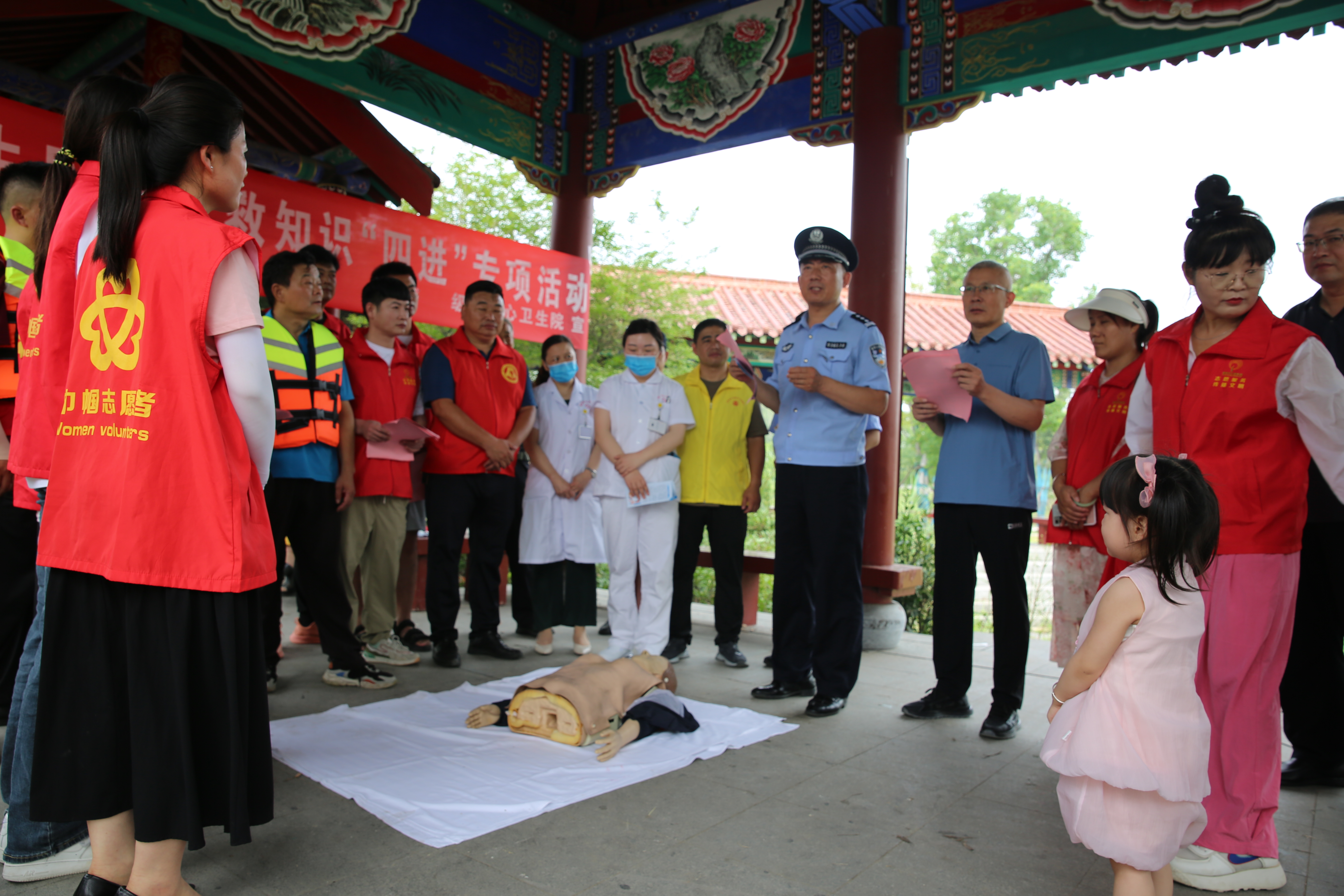 活动中,志愿者在人员集中的地方,发放防溺水宣传单,为家长和青少年讲解防溺水的重要性,引导大家注意自我保护,牢记防溺水“六不准”,远离危险水域;派出所结合身边的惨痛案例,叮嘱家长要切实履行好监护责任,加强对孩子的监管,严禁孩子私自下水游泳、不带孩子到存在安全隐患、无救护设施的水域游泳,不让让孩子独自到河边、水库等危险区域玩耍;中心卫生院为大家讲解演示了心肺复苏急救方法,增强广大群众的急救意识和急救能力,使大家熟练掌握心肺复苏的知识及技术要领,掌握基本的自救、互救本领,及时把握“黄金4分钟”,为后续医疗机构系统救治赢得宝贵时间。