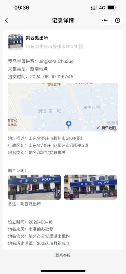 原来,8月3日滕州市公安局荆西派出所正式启用,该所为周边4个社区11万居民,以及各类流动群体提供警务服务。由于新设的原因,互联网地图上尚未标注,虽然各方面对新派出所的位置做了大力宣传,可一定程度上还是给办事的群众带来不便。市民政局区划地名办得知这一情况后,会同地名志愿者第一时间到现场进行实勘,利用“地名标注小程序”采集实景图片、扫描文书文件和进行实时定位,多次对接和加班加点上报材料,并顺利通过国家地名数据库审核,在之后不到一周时间,就实现了百度、高德、腾讯等互联网地图共享,群众可以通过各类导航APP实现“一键直达”,跑出了地名服务高质量发展的“滕州速度”。