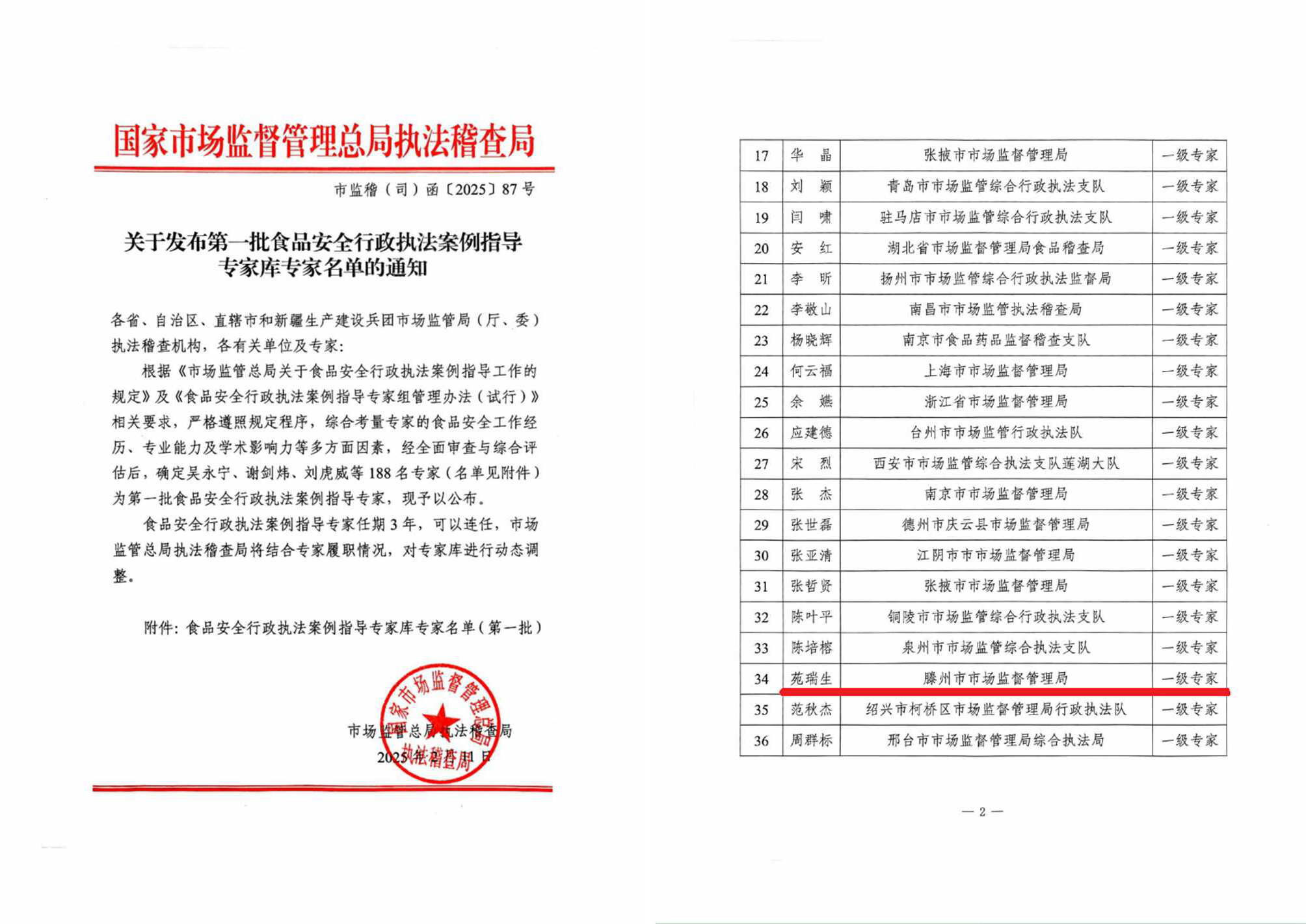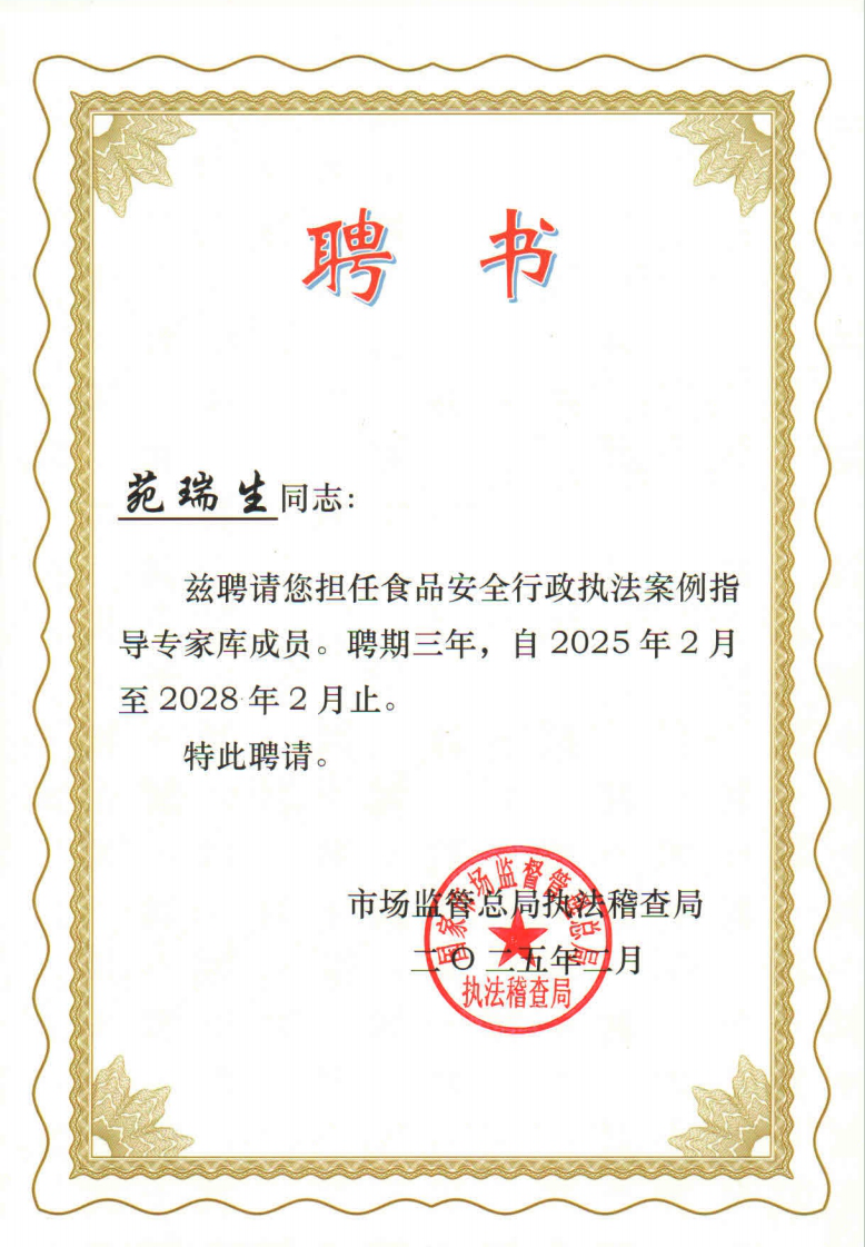近日,市市场监管局苑瑞生同志被国家市场监管总局稽查局聘为食品安全行政执法案例指导一级专家。据悉,此为总局稽查局聘任的第一批食品安全行政执法案例指导专家,共188名,其中一级专家54名,全省市场监管系统中获此殊荣的仅有3名。