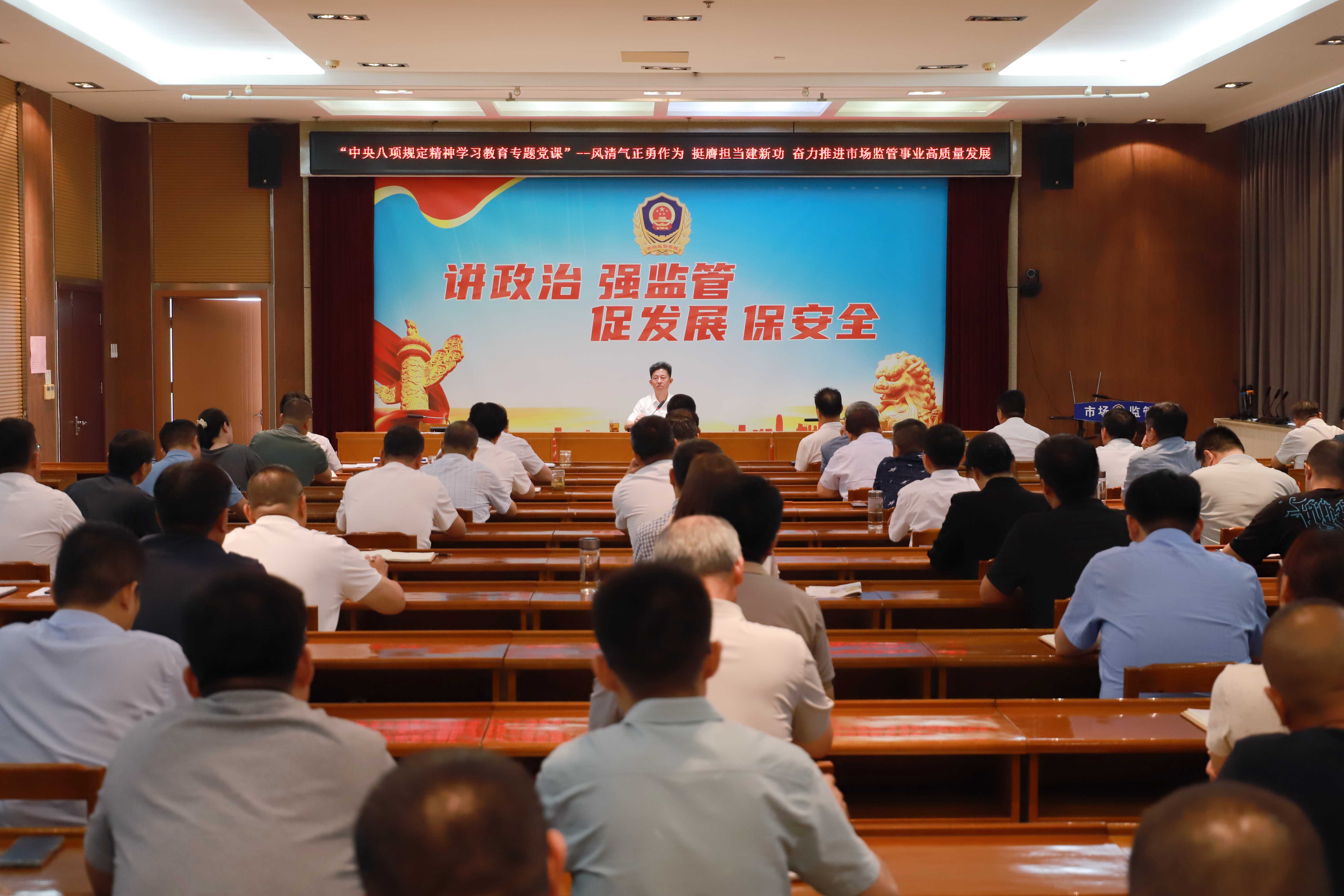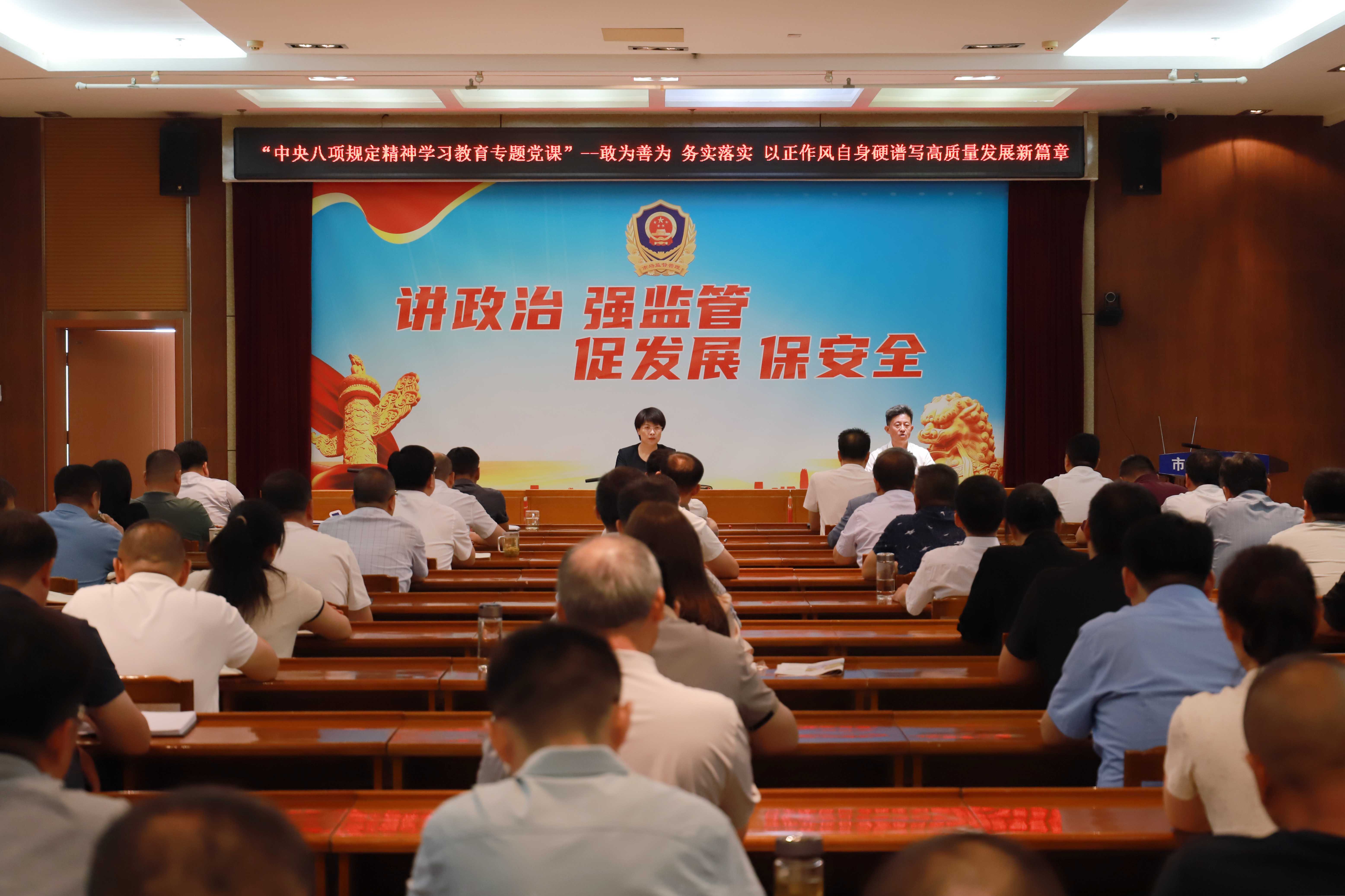 根据市委关于深入贯彻中央八项规定精神学习教育工作安排,6月30日上午,市政府党组成员、副市长刘琳以《敢为善为 务实落实 以正作风自身硬谱写高质量发展新篇章》为题,为市场监管局党员干部讲授深入贯彻中央八项规定精神学习教育专题党课。局领导班子、综合检验检测中心班子、协助分管领导工作的科级干部、各单位主要负责人参加会议。局党组书记、局长陈凡锋主持会议。