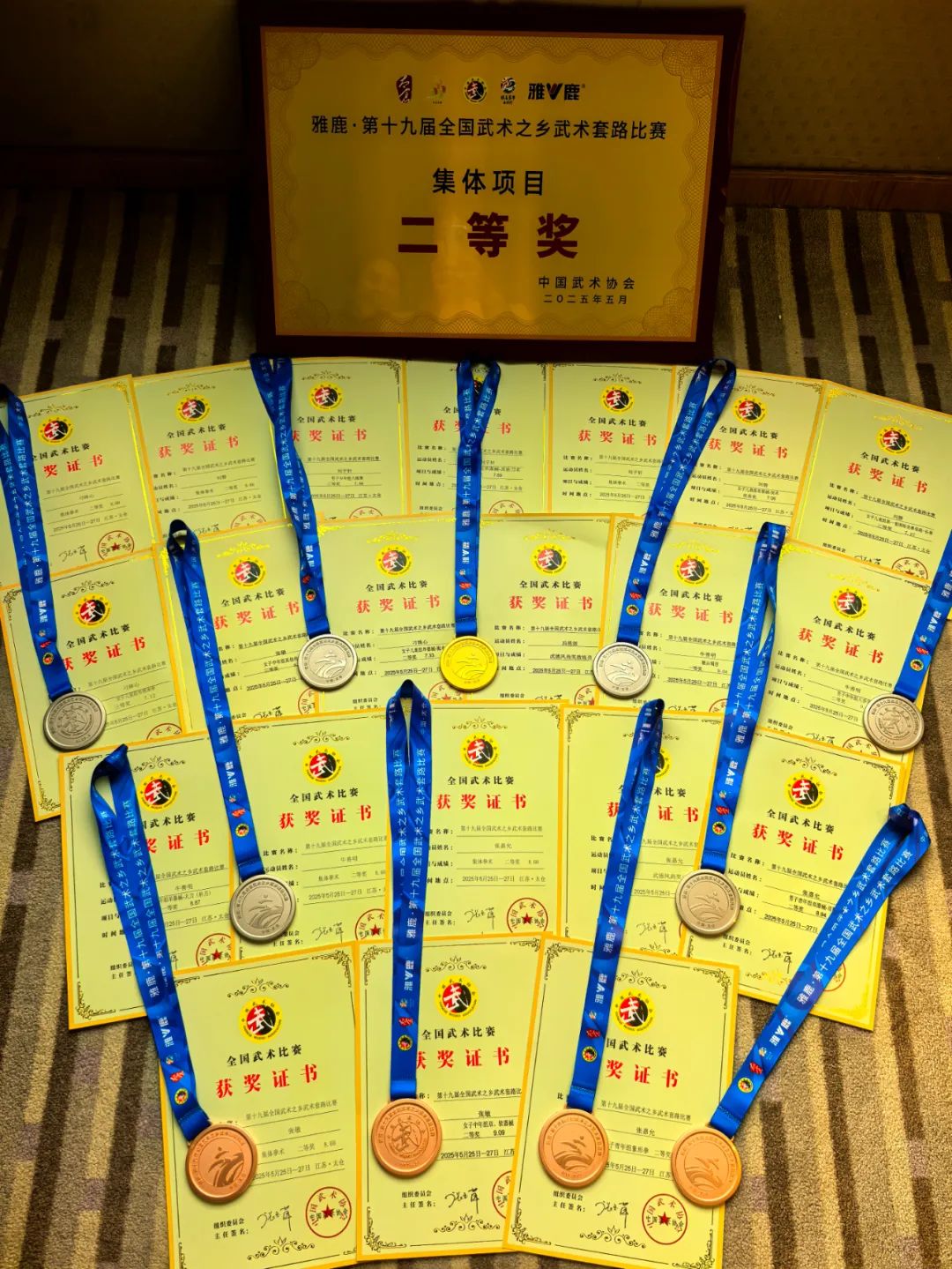 铜牌4枚:张敏 女子D组传统拳术,刘磐 女子A组规定拳术,刁姝心 女子A组规定南拳,刘子轩 男子B组传统拳术。