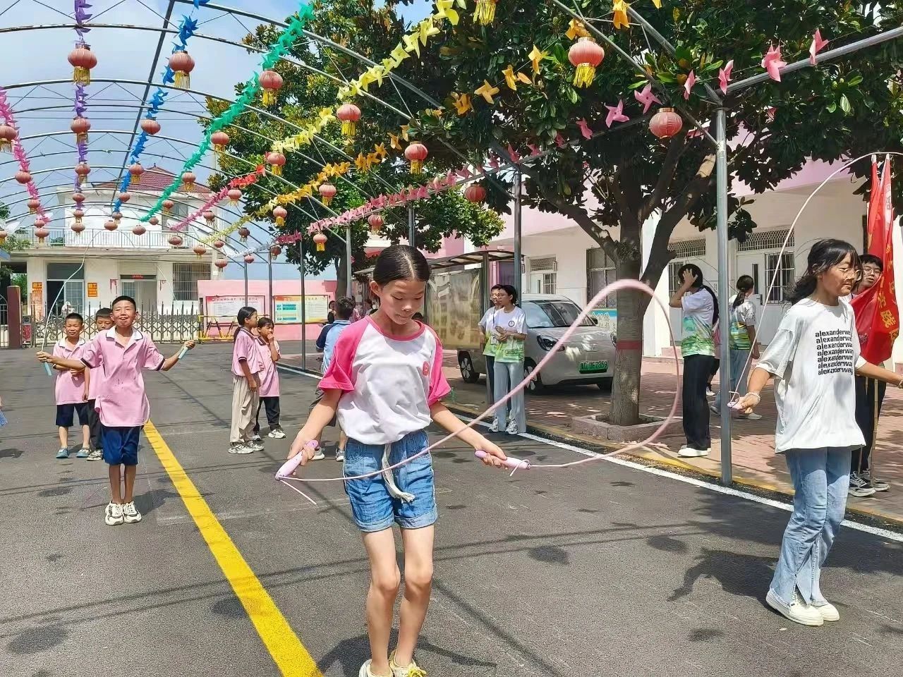 比赛现场精彩纷呈。篮球运球项目中,小选手们单手运球,眼神专注,步伐矫健,篮球在他们手中灵活穿梭,展现出良好的球技与拼搏精神。跳绳接力赛更是将团队协作发挥到极致,孩子们配合默契,跳绳在空中划出一道道优美的弧线,每一次成功的接力都伴随着欢呼与掌声。而在羽毛球投准项目里,小选手们全神贯注,挥拍、击球,动作有模有样,现场充满了欢声笑语,孩子们在运动中尽情挥洒汗水,享受快乐。