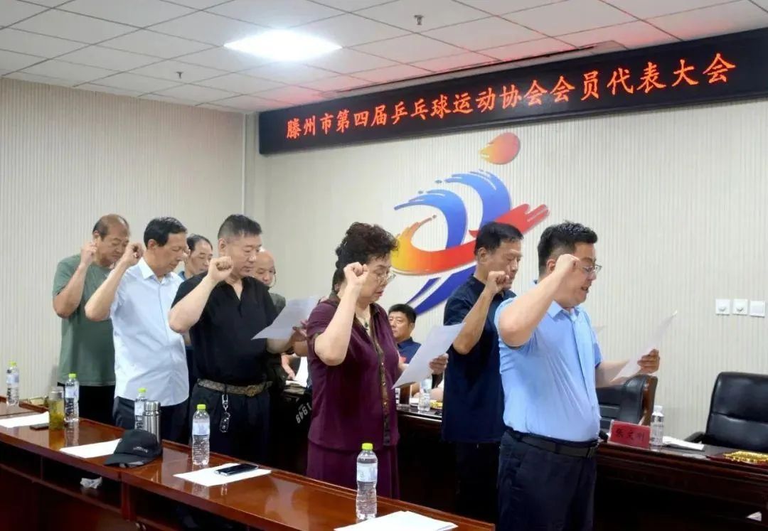 会议由冯恩源主持,第三届乒乓球运动协会会长徐海江代表协会作工作报告,回顾了过去几年协会在乒乓球普及推广、赛事举办、对外交流、青少年培养等方面取得的成绩。大会审议通过了《滕州市乒乓球运动协会章程(草案)》,选举产生了第四届理事会领导班子:丁德涛当选会长,马贵廷、王琦、华平、邢志存、张文刚、张炫、张道龙、李舟、陈忠波、周晓峰、满高石当选副会长,张文刚兼任秘书长,马贵廷、王琦、张道龙当选监事会监事。新当选会长丁德涛作表态发言,他表示将带领新一届理事会成员恪尽职守,继续推动滕州乒乓球事业创新发展。会议还举行了隆重的聘书颁发仪式,丁德涛聘请第三届乒协主席徐海江为第四届乒协顾问,新当选理事会成员面向国旗庄严宣誓。