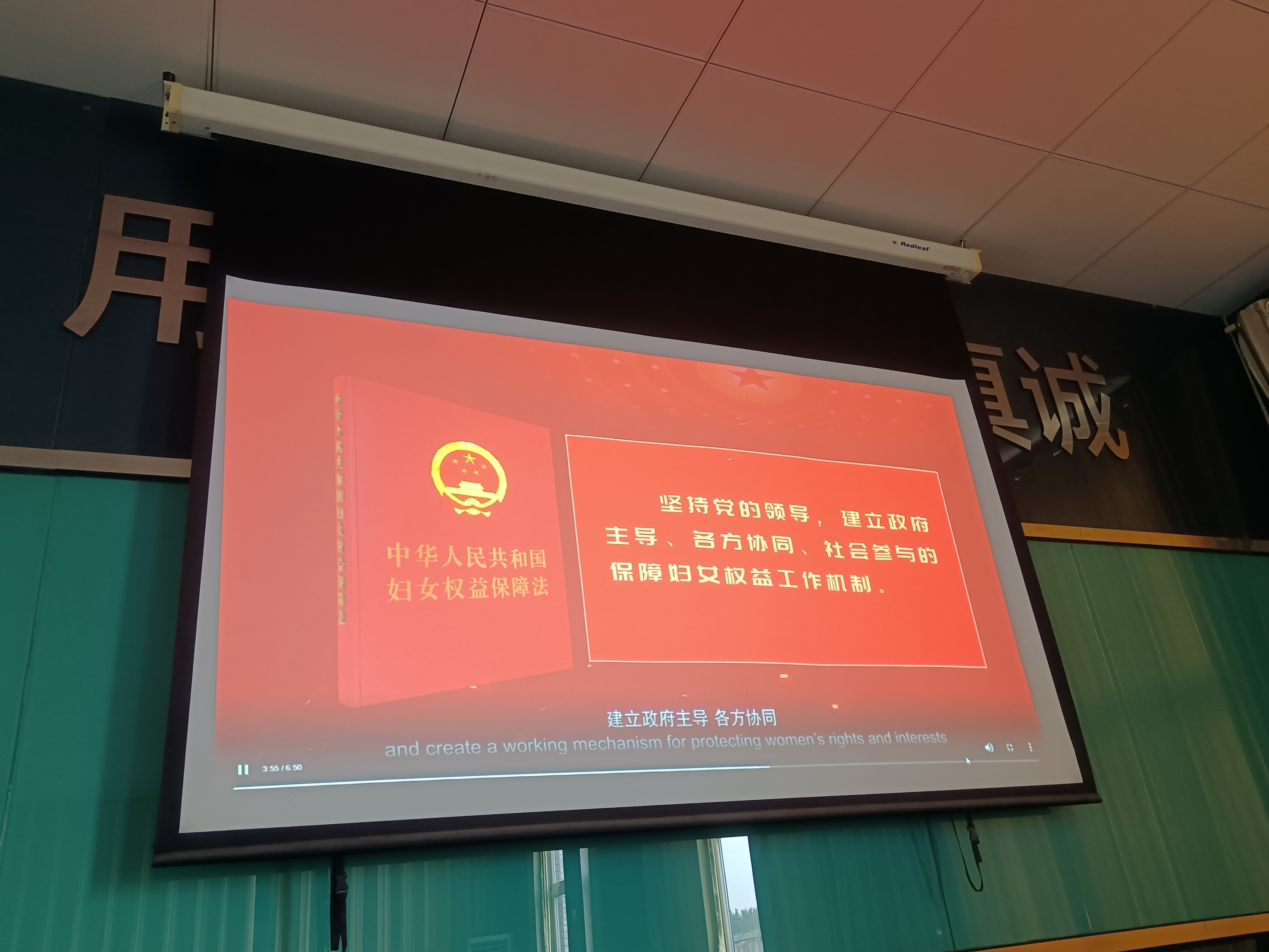 随后,与会人员共同观看了妇女权益保障法宣传片。通过学习《妇女权益保障法》宣传片,让大家了解到妇女在历史发展进程中的重要性,没有妇女解放和进步,就没有人类解放和进步。新时代经济社会发展更离不开每一位妇女的参与,因此广大妇女群众更要尊法学法守法用法,要以更强的历史责任感和主人翁精神,投身全面建设社会主义现代化国家的实践中,争做伟大事业的建设者、文明风尚的倡导者、敢于追梦的奋斗者。