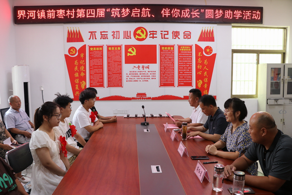 近日,界河镇前枣村第四届“筑梦启航、陪你成长”助学圆梦公益活动在村委会举办。本次助学对象是来自前枣村的6名学生,他们中有5人今年新参加高考被本科院校录取,1人由硕士研究生考取博士研究生。