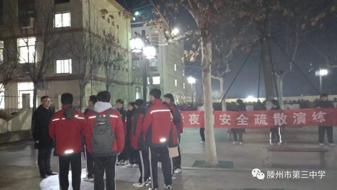 为进一步做好学校防震防踩踏安全教育工作,增强师生防震减灾意识和应急反应能力,提高学校各科室综合防灾、组织协调和应急处置能力,2023年12月24日21点30分,滕州市第三中学组织夜间防震防踩踏应急疏散演练活动。