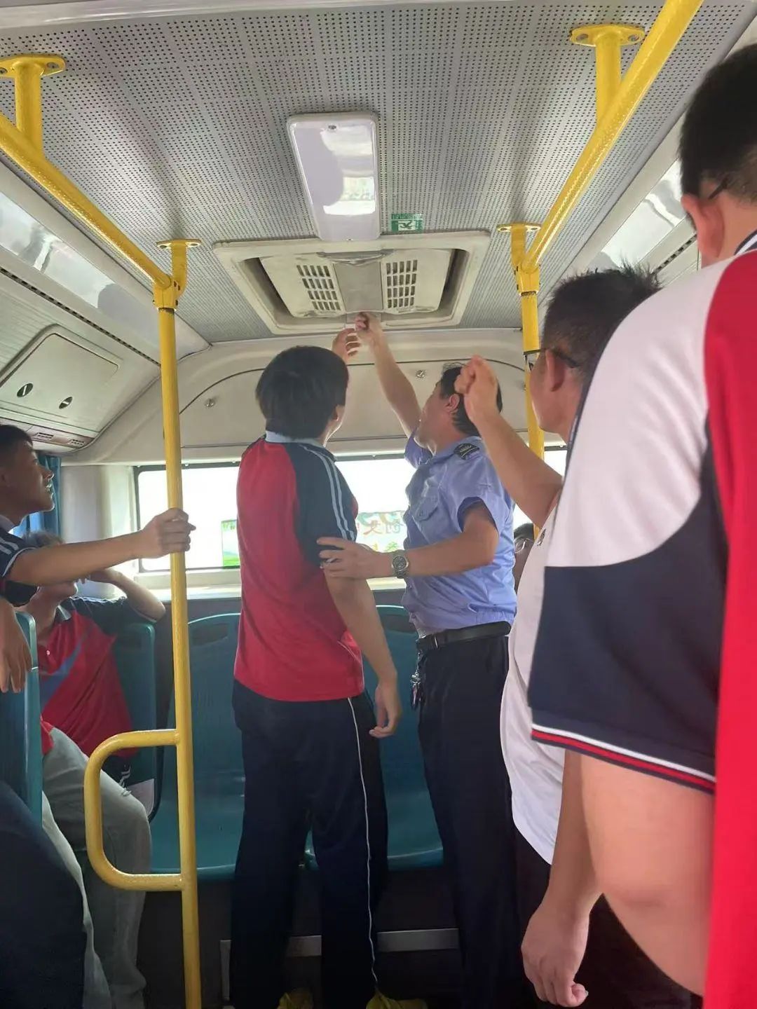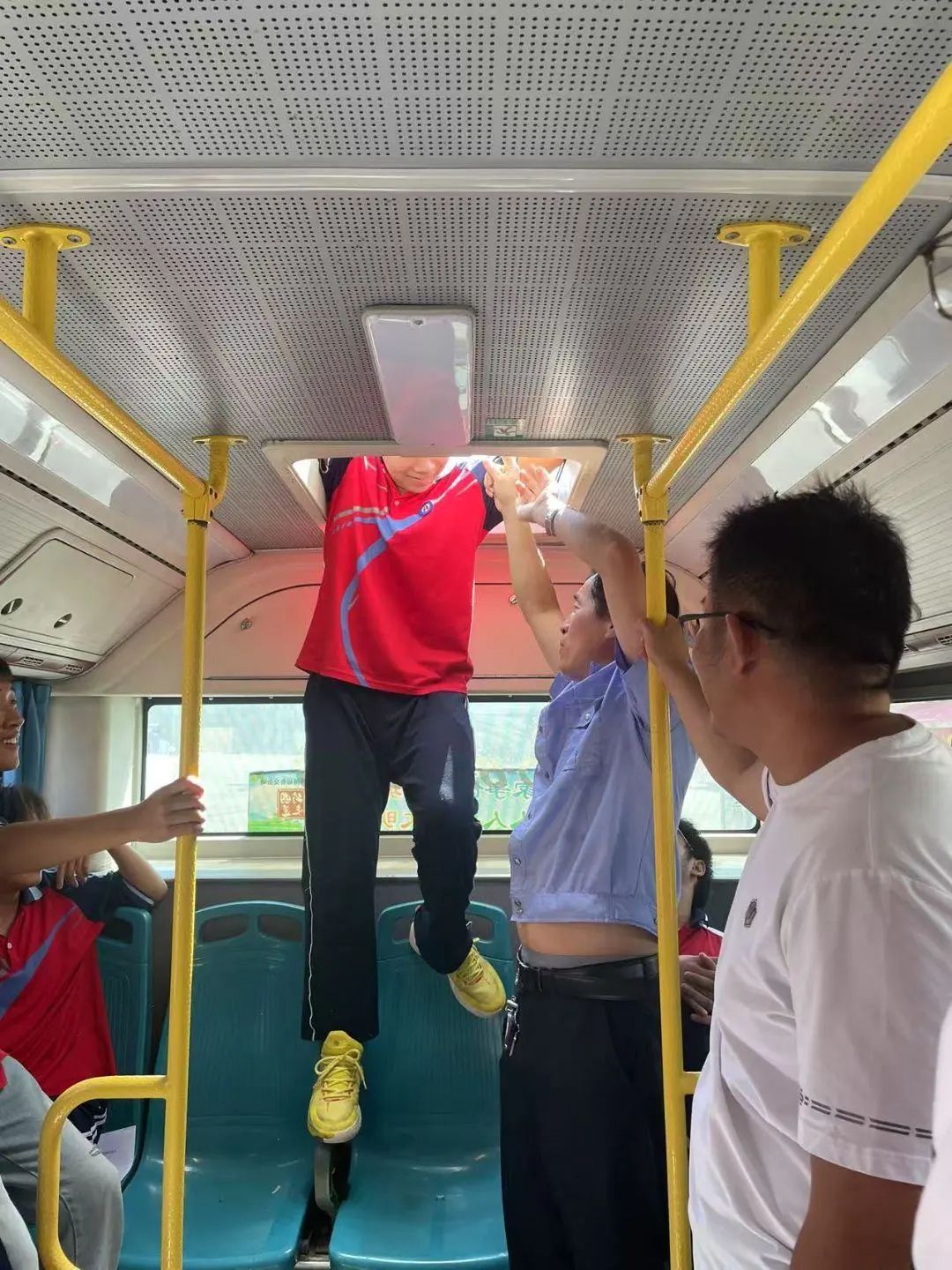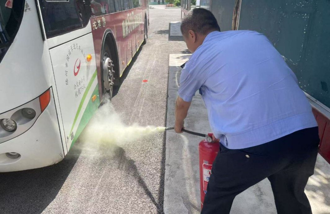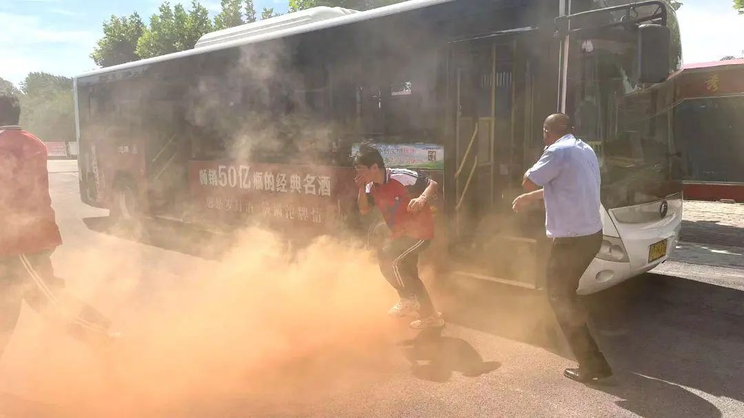 在演练环节,模拟公交车突遇“火情”,驾驶员迅速靠边停车,打开警示灯,开启车门,并引导学生们用衣袖捂住口鼻,弯腰从距离最近的前后车门有序地撤离到安全区域。工作人员立即清点学生人数,同时拨打电话报警,并利用灭火器对起火部位进行扑救。