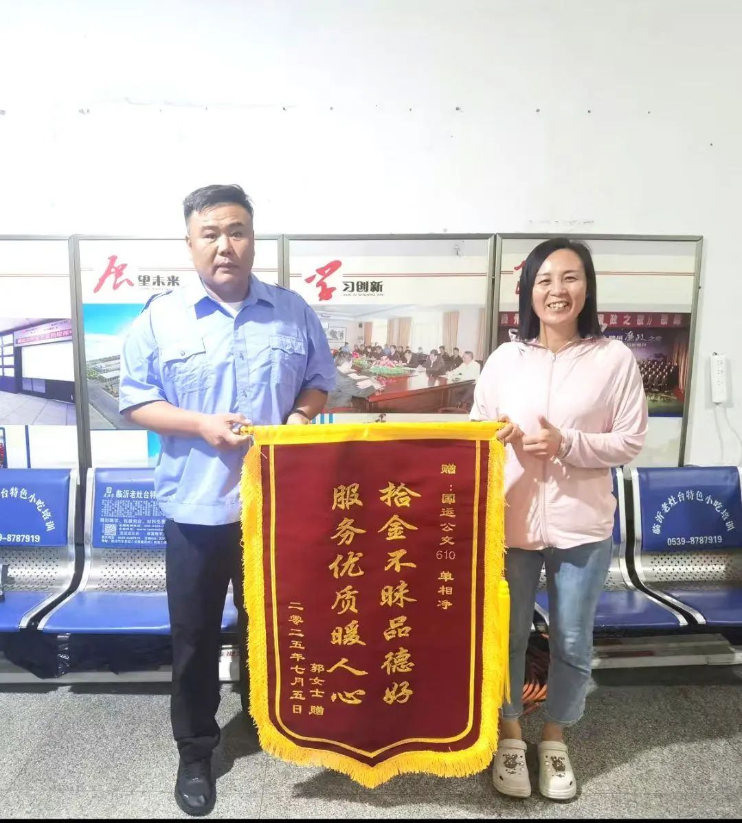 经多方沟通,单师傅成功与郭女士取得联系。当日下午,郭女士赶到调度室核对信息后,单师傅将手包完整归还。面对失而复得的财物,郭女士激动不已,连连称赞单师傅拾金不昧品德高尚,服务贴心温暖人心。为表达深切谢意,郭女士专程将一面绣有“拾金不昧品德好,服务优质暖人心”的锦旗送至公司,亲手交到单相净师傅手中。