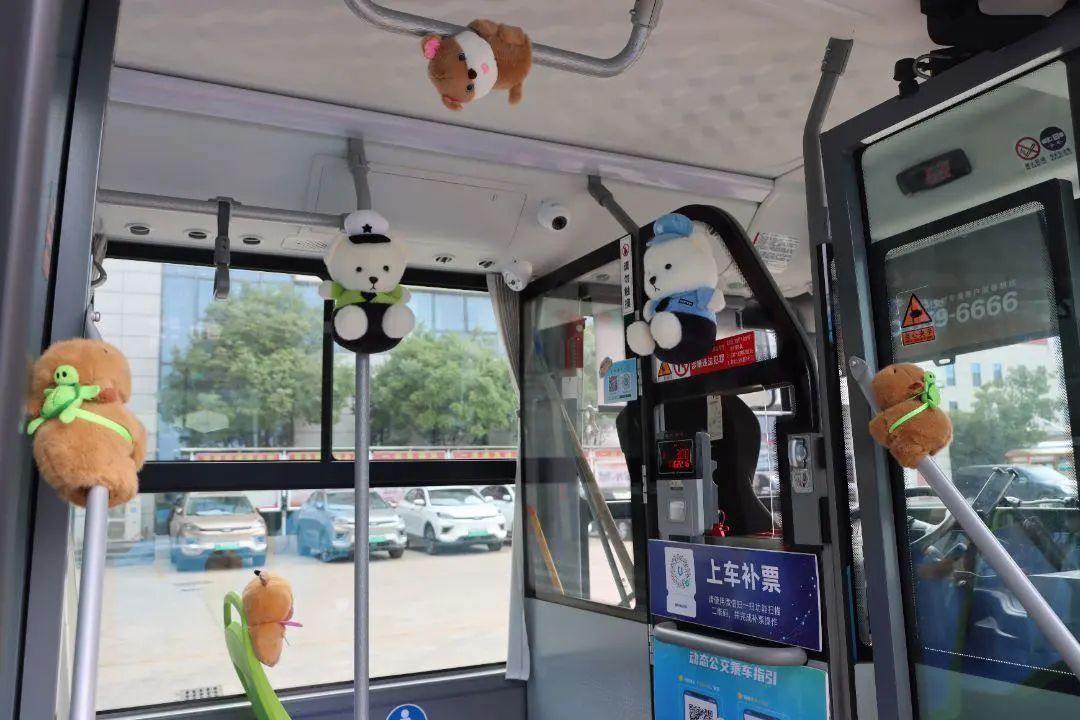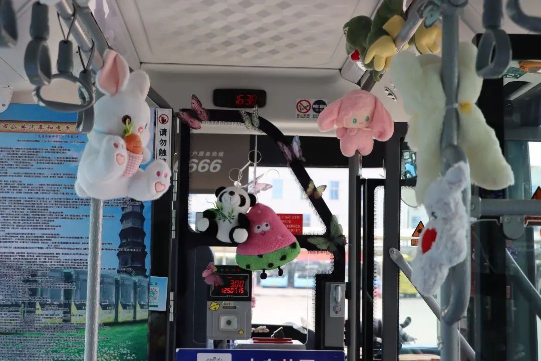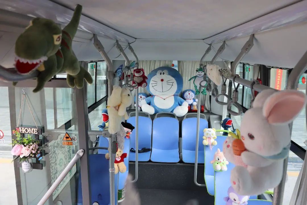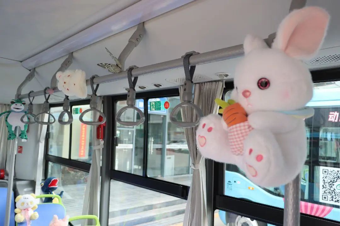 走进车厢,童趣与温馨扑面而来。驾驶员师傅们精心布置的细节随处可见。扶手被毛茸茸的小熊、小猫玩偶温柔环绕,乘客抬手抓握时便能触到柔软。