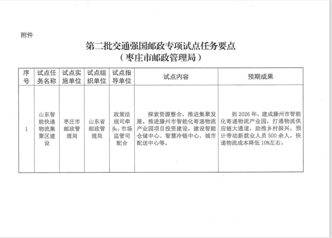 近日,国家邮政局印发《国家邮政局关于第二批交通强国邮政专项试点任务的批复》,山东智能快递物流集聚区建设项目(交发集团鲁南国际干杂海货智慧物流港项目)成功入选第二批交通强国邮政专项试点任务。