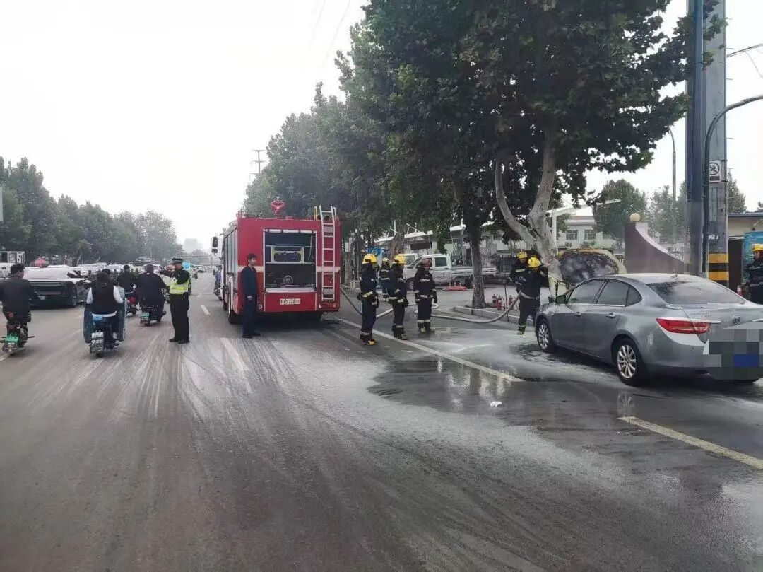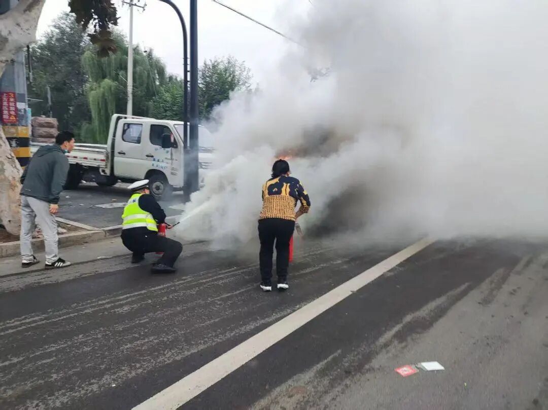 眼见火势蔓延,王莉立即安全靠边停车、拉紧手刹、开启双闪警示灯,并向车内乘客解释,便迅速拿起灭火器冲向自燃车辆。在路口执勤民警的协助下,王莉临危不乱,拔销、握管、压柄,白色干粉精准覆盖火源根部,迅速压制住了火势。这番专业的处置也为后续消防人员救援赢得了宝贵时间。