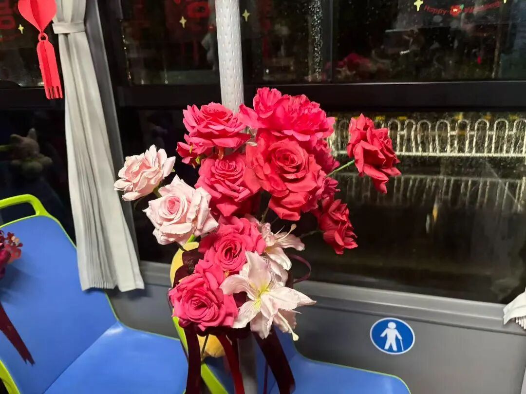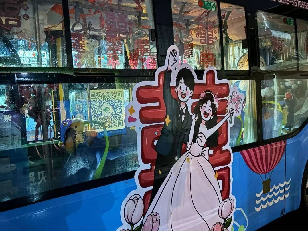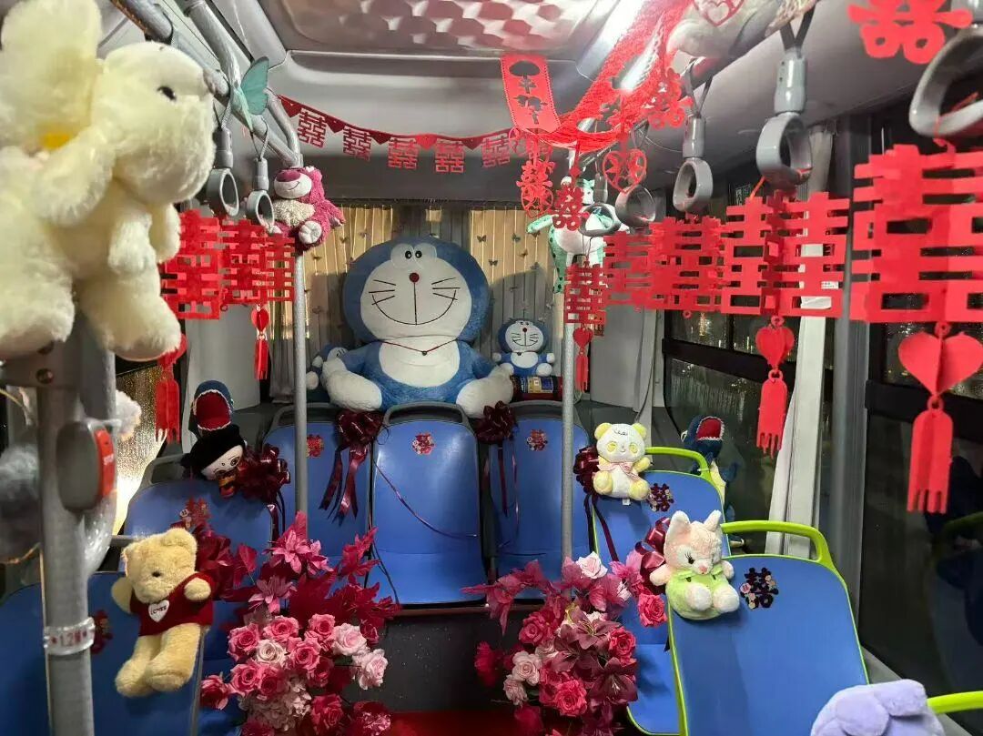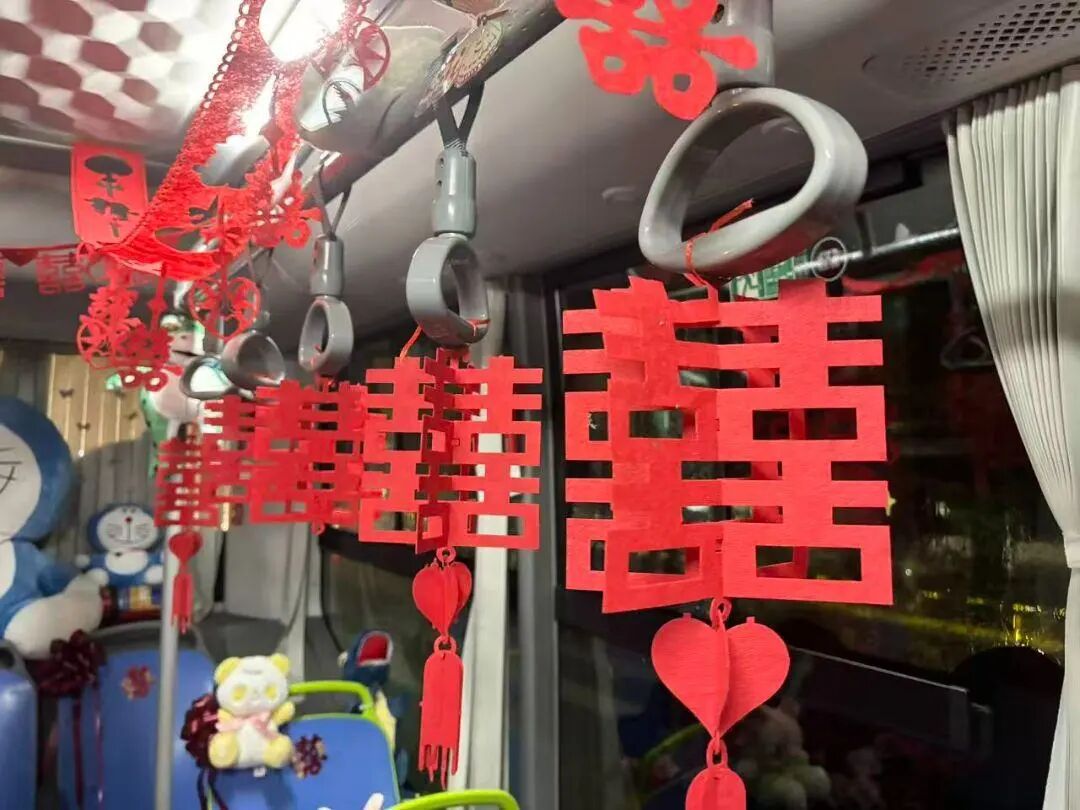 走进公交“宝宝巴士”,喜庆与萌趣更是扑面而来。车内,娇艳的鲜花簇拥在座椅旁,粉红与大红交织出温柔的仪式感;“囍”字拉花缠绕着车顶与吊环,随风轻晃间增添了几分灵动;哆啦A梦等可爱毛绒玩偶乖乖“坐”在座位上,圆滚滚的模样仿佛正为新人欢呼。车外,新人专属的卡通造型贴于车身两侧,画中两人笑容灿烂、手牵着手,满是幸福模样。这份萌趣外观与喜庆氛围的完美融合,引得路过市民纷纷驻足,举起手机定格这份独一无二的浪漫。