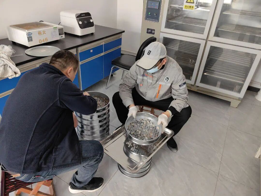 工作小组深入石料生产源头,实地考察矿山开采与生产工艺,并同厂家技术团队进行深入交流,全面评估其质量的稳定性与可靠性,并督促厂家严格落实出厂自检,确保产品供应合格达标。同时对进场石料采取“一车一查、一批一检”的质量监督措施,确保石料规格粒径、含泥量、压碎值、针片状含量等技术指标完全符合施工生产的需求,坚决将不合格石料筛除在生产环节之外。