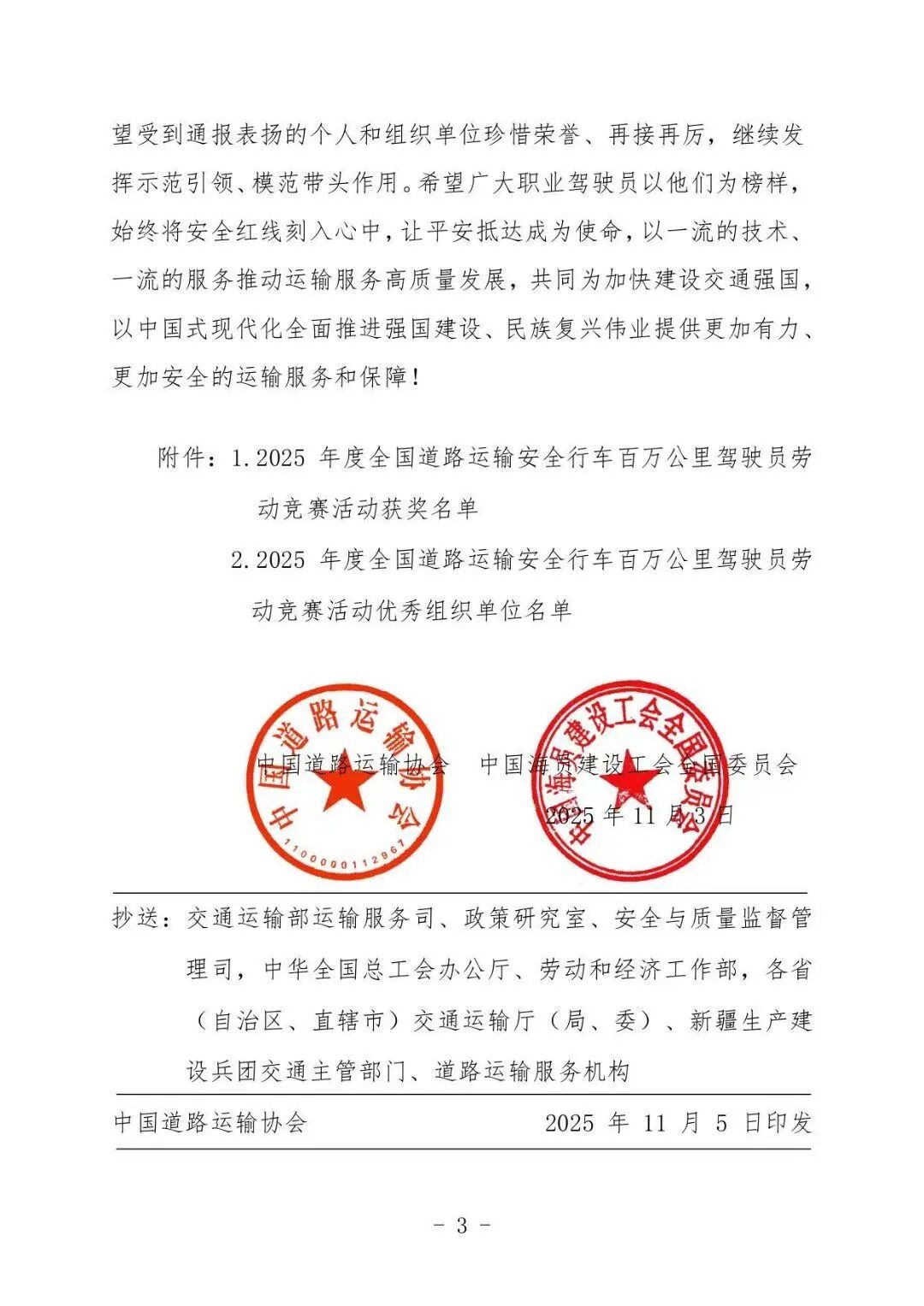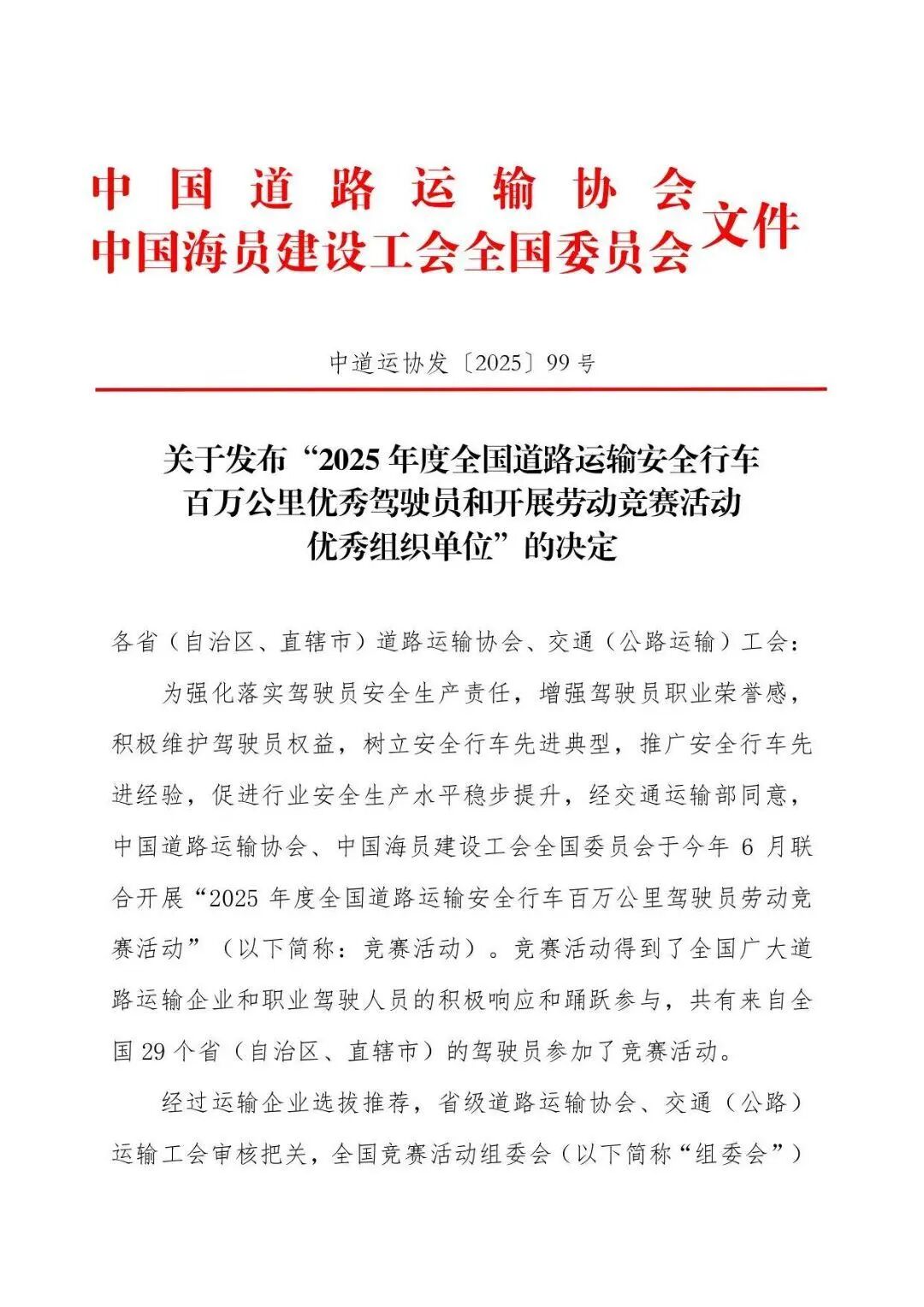 近日,由中国道路运输协会与中国海员建设工会全国委员会联合主办的“2025年度全国道路运输安全行车百万公里优秀驾驶员和开展劳动竞赛活动优秀组织单位”评选结果揭晓,交发集团公交公司驾驶员赵海峰,凭借精湛的驾驶技艺与扎实的安全素养,在评选中脱颖而出,荣获“2025年度全国道路运输安全行车百万公里优秀驾驶员”称号。