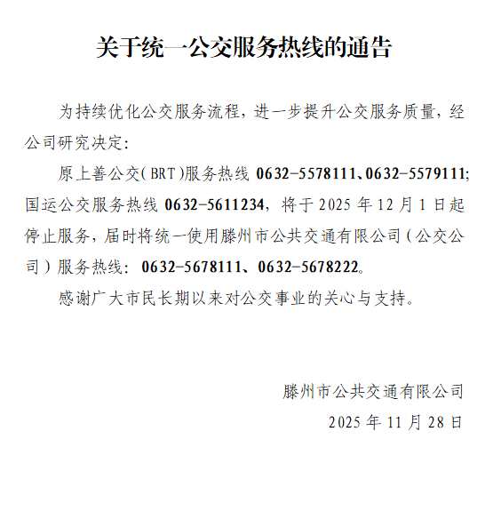 关于统一公交服务热线的通告