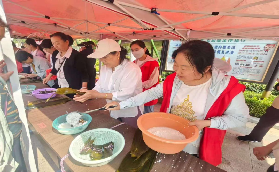活动现场热闹非凡,五彩的丝线、翠绿的粽叶、饱满的糯米,将节日的氛围渲染得格外浓厚。包粽子区域围满了居民,大家纷纷拿出看家本领,捋粽叶、填糯米、封口、扎捆,动作娴熟,一气呵成。不会包的居民也在一旁认真学习,虚心请教,现场欢声笑语不断。不一会儿,一个个形态各异的粽子便堆满了桌子,有三角粽、四角粽,还有小巧玲珑的迷你粽,每一个都饱含着大家对节日的美好祝愿。