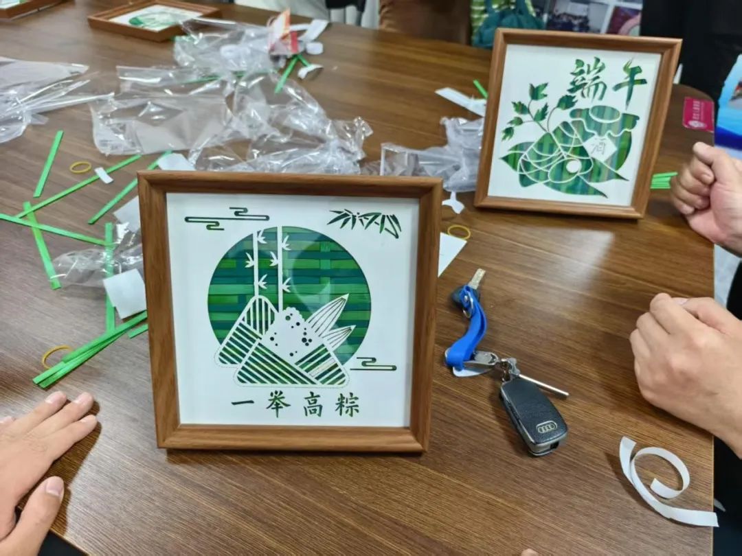 非遗竹编画区域,由专业非遗传承人驻场指导。从竹篾的精细处理,到图案的巧妙编织,老师手把手教学,带领居民体验竹编画的独特魅力。参与者可以根据自己的喜好,创作出一副副精美作品。每一幅作品都凝聚着传统工艺的智慧,不仅是精美的手工艺品,更是一份珍贵的端午文化纪念。