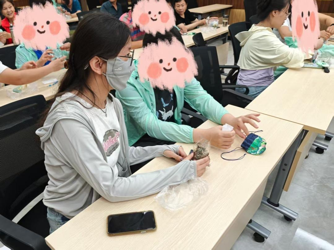 国风荷包DIY环节,活动讲师邀请爱心宝贝,在爱心妈妈的陪伴和协助下,制作荷包。爱心宝贝纷纷动手尝试,从拆香料、填充香料到彩绳装饰,每一个步骤都认真细致。爱心妈妈与爱心宝贝携手合作,现场气氛温馨而融洽。经过一番努力,一个个精致美观的刺绣荷包逐渐成型,看着自己亲手制作的作品,爱心宝贝的脸上洋溢着幸福的笑容。