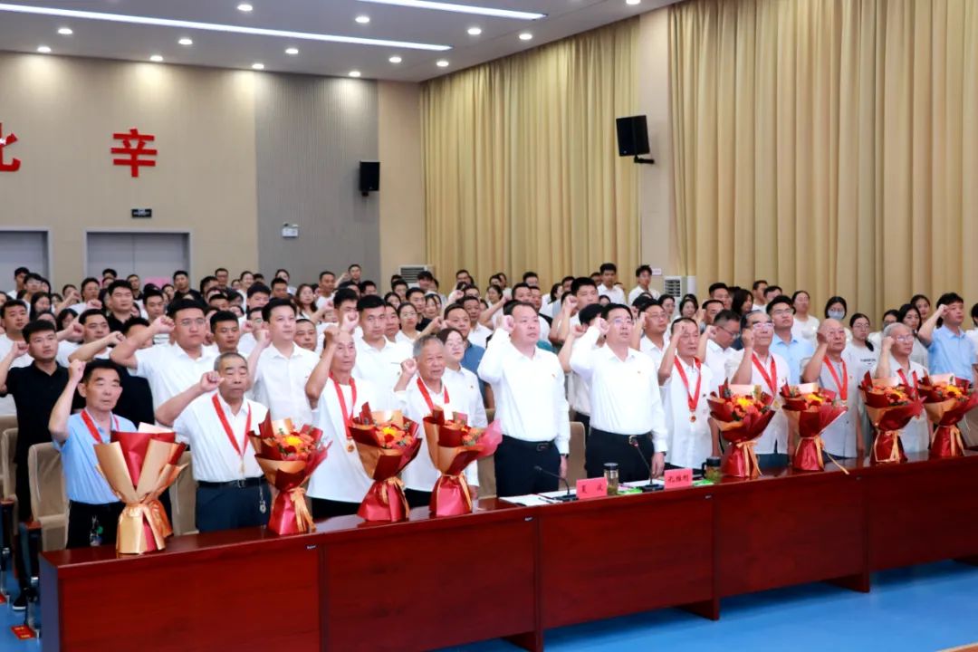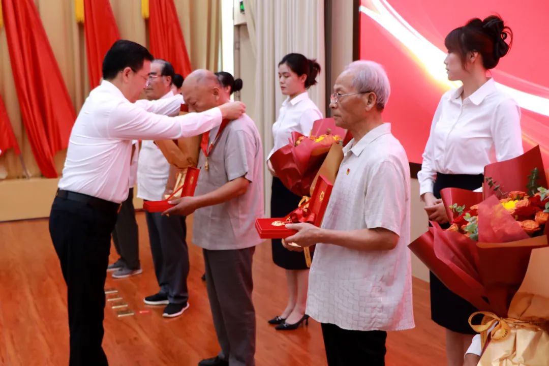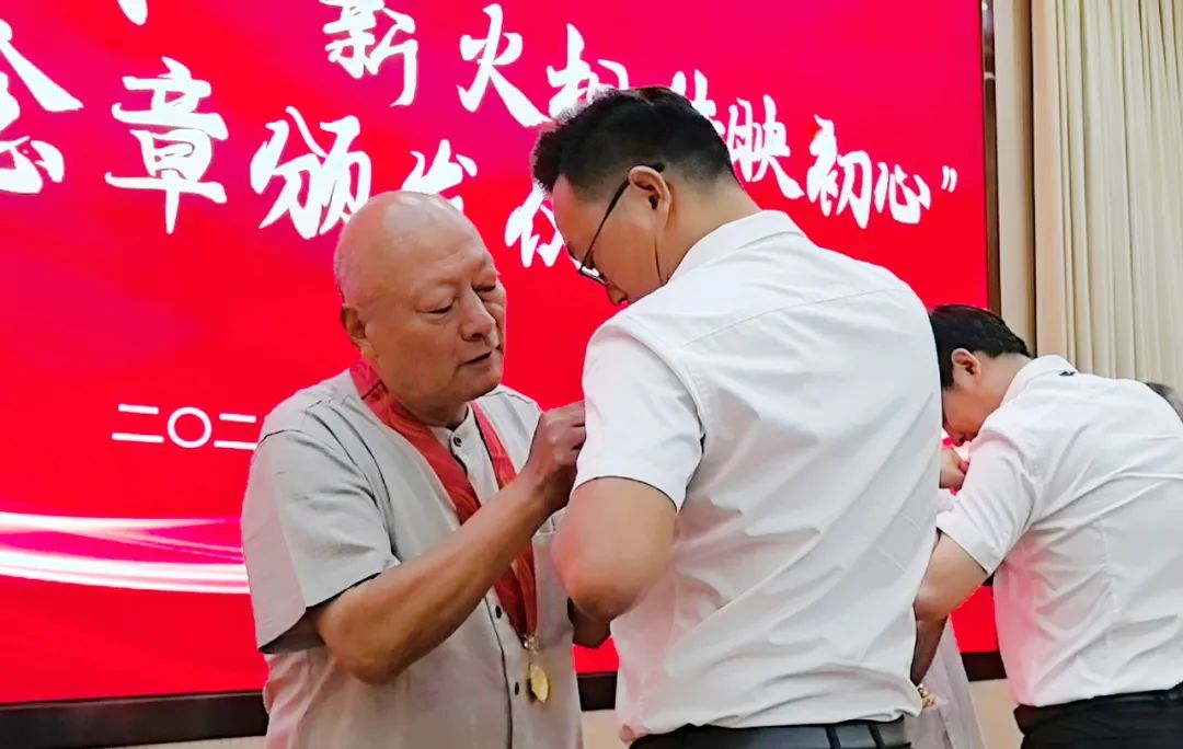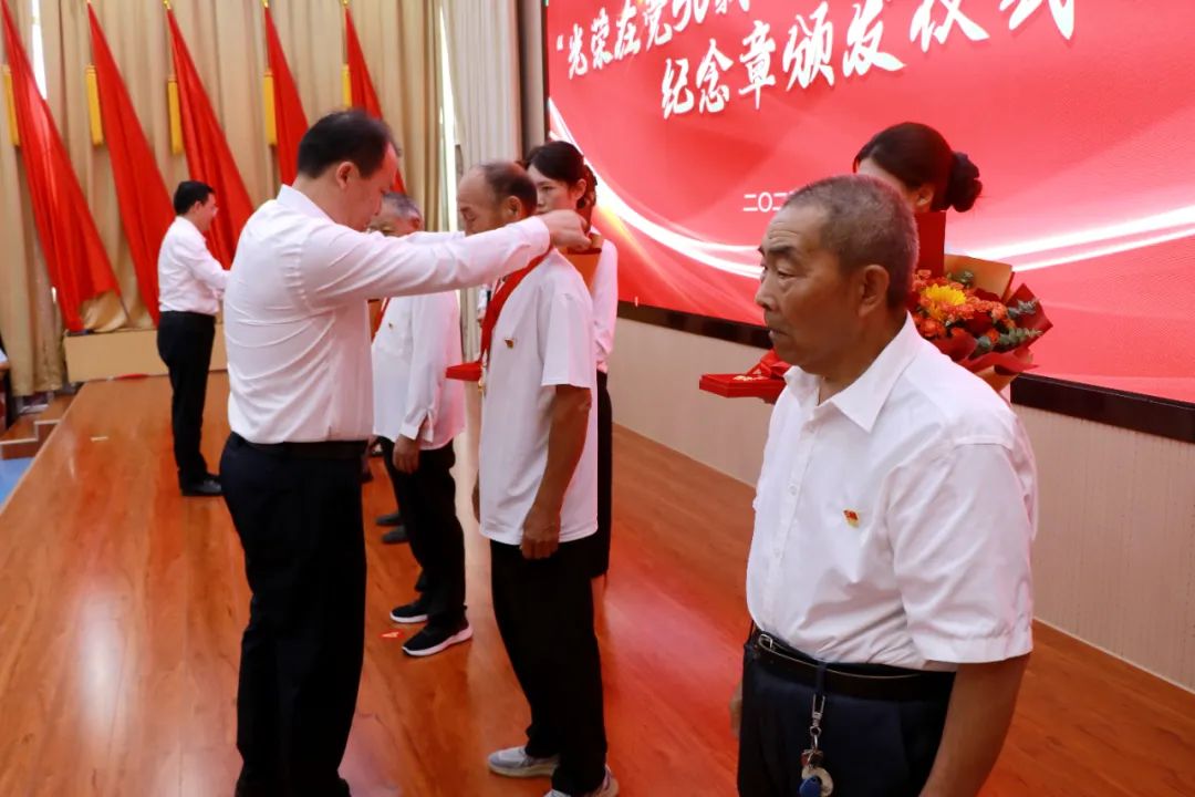 颁发仪式上,党工委书记夏波,党工委副书记、办事处主任孔维刚分别为8名党龄达到50周年的老党员代表献花,并颁发“光荣在党50年”纪念章,向他们传递党的关怀和温暖;老党员代表为2025年新发展党员佩戴党徽,既寓意着红色力量的薪火相传,更寄托着对年轻党员的殷切期盼;随后,党工委委员、武装部部长、组织委员韩博带领全体党员进行入党宣誓,重温入党时的庄严承诺。
