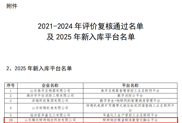 近日,山东省工业和信息化厅公示了2025年省级工业互联网平台新入库名单及评价复核通过名单。我街道企业表现亮眼:山东腾达特种钢丝科技有限公司的“特种钢丝精益制造数智化融合平台”成功入选省级工业互联网平台新入库名单。