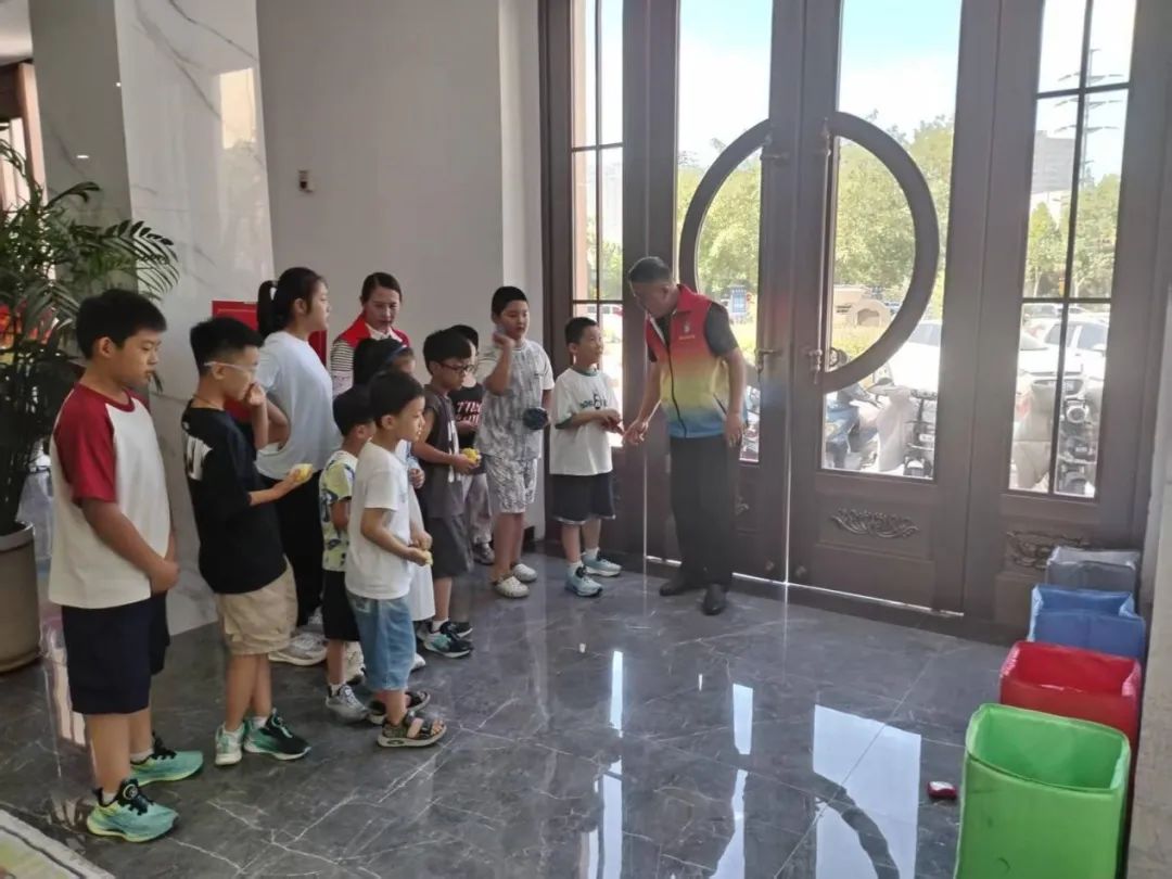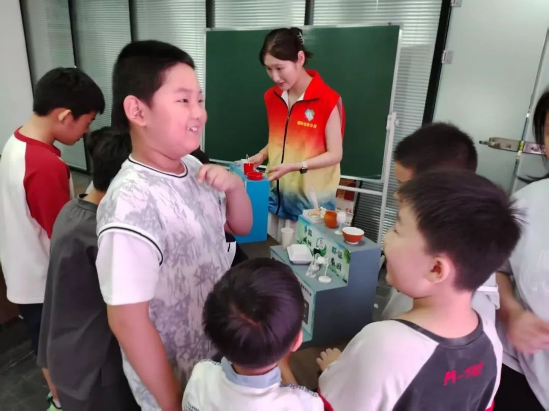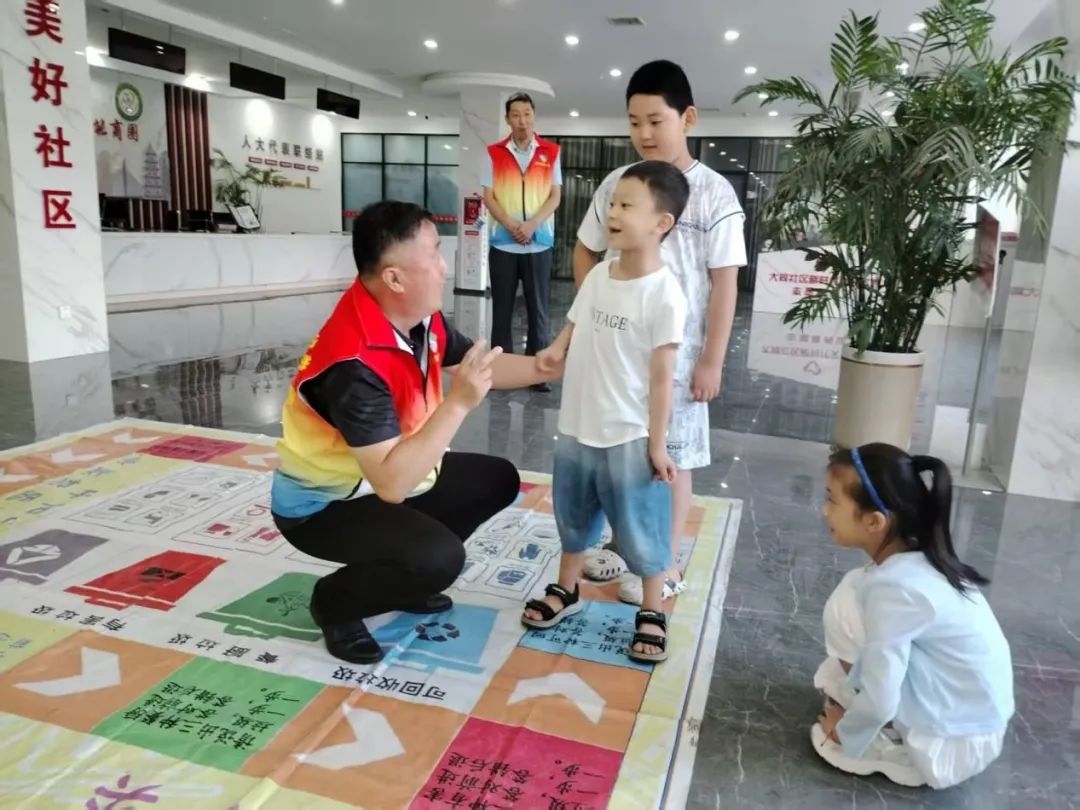 “垃圾分类闯关赛”则更具挑战性:工作人员在场地一侧画好起点线,另一侧设为终点,中间每隔两米贴一道标记线。孩子们分成小组,先和工作人员玩“剪子包袱锤”,赢的一方可以往前走三步,输的则需回答一道垃圾分类小问题(如“用完的电池属于什么垃圾?”“苹果核应该扔进哪个桶?”),答对同样能前进三步,答错则由工作人员现场讲解后再继续。孩子们为了抢先到达终点,不仅比拼反应速度,更在答题过程中加深了对分类知识的记忆,现场笑声、欢呼声此起彼伏。
