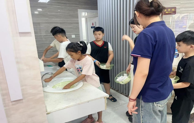 排队浸染,晾晒创作成果。作品扎制完成后,孩子们兴高采烈地排队将布料浸湿,然后再依次放入装有染色水的容器中。经过一段时间的浸染,一件件色彩斑斓、图案各异的扎染作品逐渐成型。最后,大家小心翼翼地将染好的作品取出,晾晒在标有自己名字的名牌左侧。看着阳光下随风飘动的作品,每个人的脸上都洋溢着成就感和喜悦。