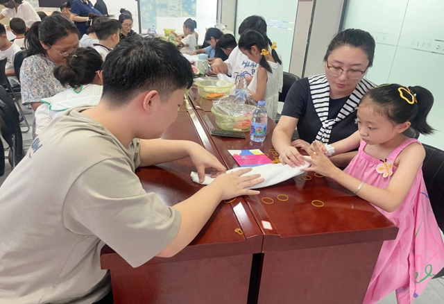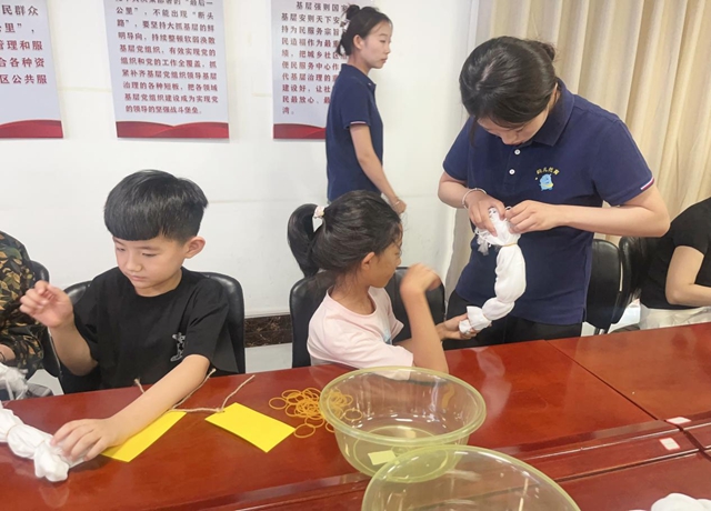 动手实践,创意扎染作品。理论讲解结束后,便进入了期待已久的动手实践环节。工作人员早已为大家准备好了白布、皮筋、染料、水盆等制作材料。家长和孩子们纷纷拿起布料、皮筋等工具,在老师和工作人员的耐心指导下,开始构思并制作属于自己的扎染作品。大家充分发挥想象力和创造力,有的将布料折叠成各种形状,用皮筋紧紧扎住;有的则用针线缝出独特的图案。现场充满了专注与欢乐的氛围,家长和孩子们相互协作,共同完成一件件充满爱意的扎染作品。