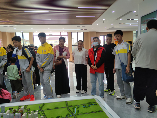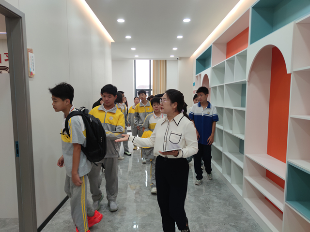 在社区讲解人员的引导下,师生们有序参观了党群服务中心各功能区域。讲解人员结合实景,详细介绍了社区在便民服务、文化建设、志愿服务等方面的职能,重点讲解了三楼的特色功能空间。这里不仅设有面向青少年的自习托管室,为学生提供安静的学习环境,还配备了藏书丰富的图书室和开放式书画室,满足不同兴趣需求。