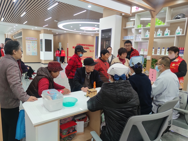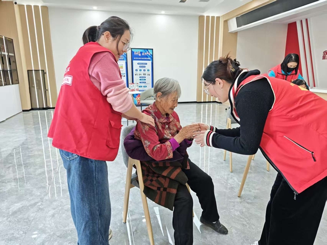 与此同时,便民服务区的关爱不曾停歇。市中医院的康养团队为老人们提供免费量血压、中医把脉、艾灸等服务,医生们细致询问老人们的身体状况,耐心解答健康疑问,并给出针对性的养生建议,让老人们在家门口就能享受到专业的医疗服务。安心家政的志愿者们则贴心地为老人们捶背按摩,缓解身体疲劳,轻柔的动作、暖心的交流,让老人们感受到家人般的温暖。