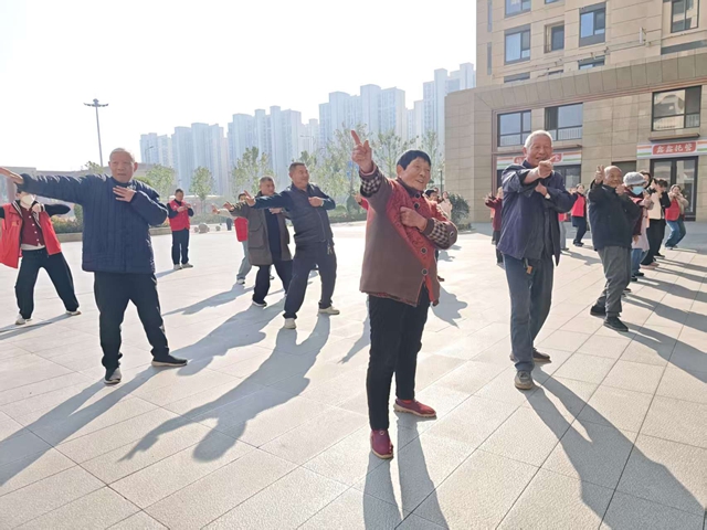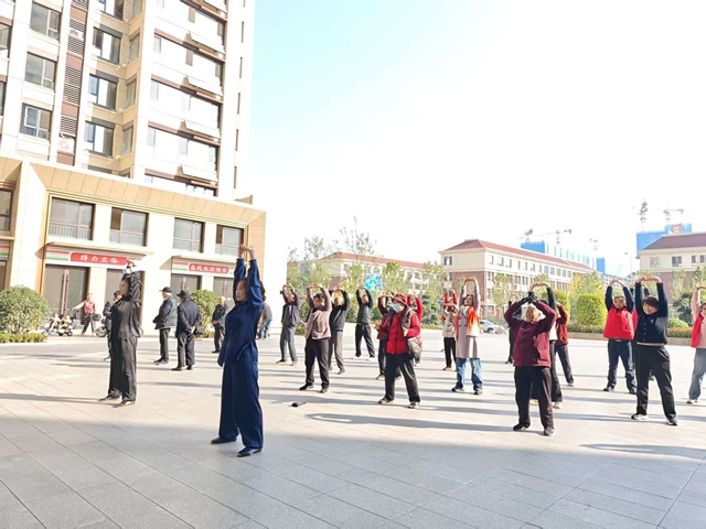 活动伊始,社区广场上热闹非凡。滕州市体育事业发展中心的专业教练们现场示范、耐心指导,带领老年朋友们练习八段锦。教练们分解每一个动作要领,从起势到收势,一招一式细致讲解,老人们精神饱满、认真模仿,伴随着舒缓的音乐,动作整齐划一,在一招一式中感受传统养生功法的魅力,现场氛围轻松愉悦。