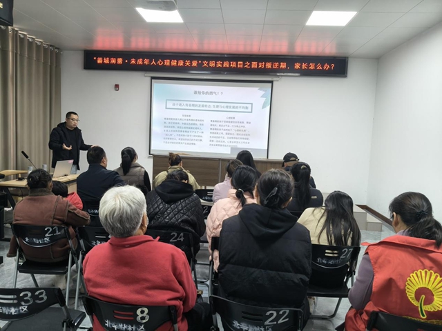 为深入推进未成年人心理健康关爱工作,帮助家长破解孩子青春期叛逆教育难题,11月7日,由滕州市委宣传部、市新时代文明实践服务中心发起实施的“善城润蕾·未成年人心理健康关爱”文明实践项目走进北辛街道北辛路社区。活动以“面对叛逆期,家长怎么办?”为主题,邀请滕州市双飞燕青青健康教育协会的资深心理学专家满孝典老师主讲。20余名家长齐聚一堂,共赴这场关乎成长与沟通的心灵之约。