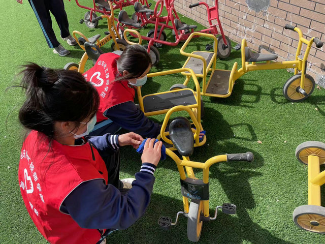 捐赠活动后,学院教师与志愿者们按照实践活动任务安排,对幼儿户外活动场所和活动器械进行了清扫和擦拭,幼儿园的户外环境焕然一新。