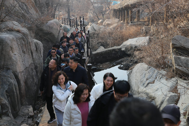 清晨,参与活动的职工们在街道门前养德公园集合,统一乘车到山脚下。大家精神饱满,装备整齐,在简短的动员和热身运动后,登山队伍沿着蜿蜒的山道向上进发。一路上,阳光穿透清冽的空气,洒在落叶点缀的山径上。职工们三五成群,相互鼓励,欢声笑语回荡在山林之间。不少人放慢脚步,用手机记录下冬日山间苍松挺立、远山如黛的别样景致。