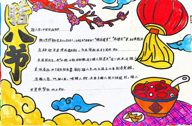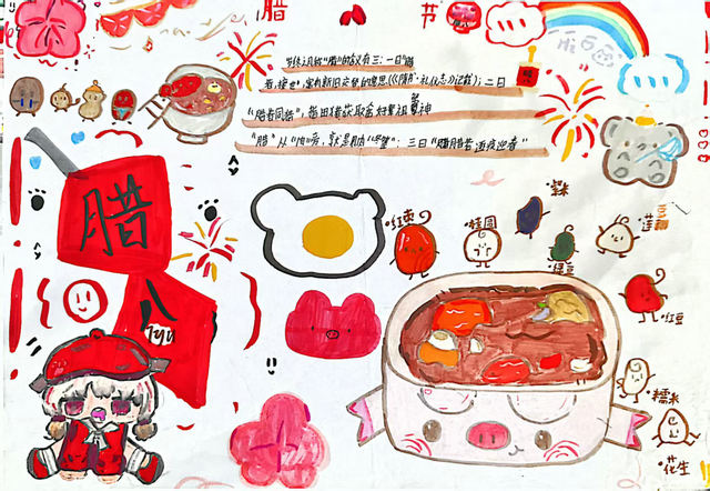 活动围绕主题班会和手抄报创作展开,引导学生在体验中感受传统节日内涵。学校各班级开展了腊八节主题班会,通过讲解、互动相结合的方式,带领学生深入了解腊八节的由来、习俗及文化意义。中高年级还开展了腊八节主题手抄报创作活动,鼓励学生通过图文表达对传统节日的理解与热爱。