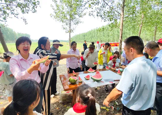 在接下来的环节,上户主村支部书记张汝超讲解西瓜的生长周期、采摘方法和挑瓜技巧。掌握了要领的孩子们迫不及待地动手采摘西瓜,个个兴奋不已。亲手采摘的西瓜,让孩子们觉得格外香甜,欢声笑语不时回荡在农场里。随后,举行了吃瓜大赛,随着裁判员示意开始,大家急速拿起西瓜,有人用埋头连啃式,有人用大口吞咽式,大家各出奇招,各寻奇策。活动现场气氛热烈,加油声、欢呼声不断。