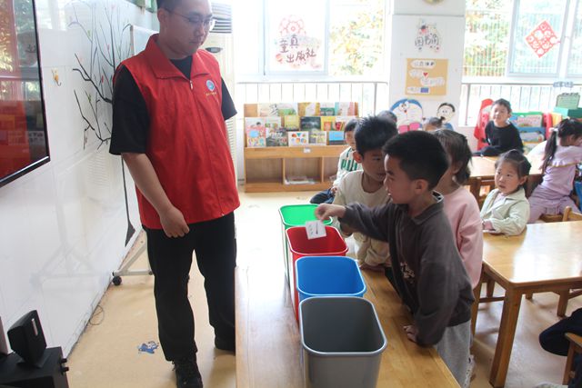环保教育从娃娃抓起。活动中,志愿者用通俗易懂的语言,给孩子们讲解世界地球日的来历,什么是垃圾分类,以及垃圾分类对于环境保护的重要意义,并以生活中常见的垃圾废弃物举例,详细介绍了可回收物、有害垃圾、厨余垃圾和其他垃圾的分类方法,让孩子们在日常生活中能够正确地进行垃圾分类。活动现场还设置了一个模拟投放的小游戏,孩子们手持垃圾分类小卡片,通过判断将卡片投放到相应的垃圾桶里。游戏过程中,孩子们兴致勃勃,踊跃参加,巩固了所学的垃圾分类知识。此次活动通过寓教于乐的方式将垃圾分类环保理念深植于小朋友们的心中,进一步引导了小朋友们从身边做起,积极参与垃圾分类行动,争当环保小卫士。