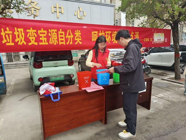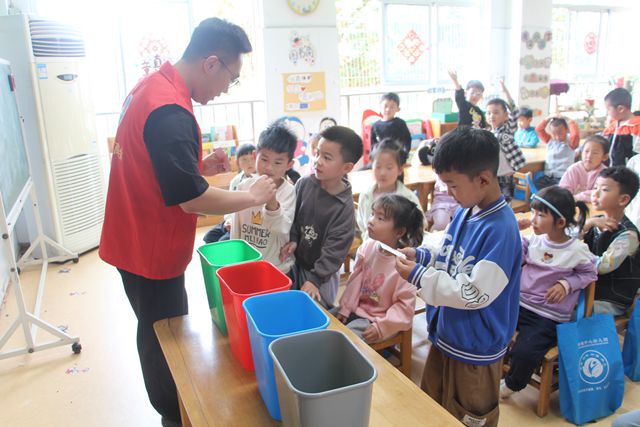 活动现场通过悬挂横幅、设立展台,发放宣传单页、校园宣讲等形式开展,志愿者用通俗易懂的语言为过往群众讲解垃圾分类的重要性、如何进行垃圾分类、垃圾分类后如何处理等方面知识,让大家对生活垃圾分类回收有了更深入的了解,引导群众从身边做起、从点滴做起,自觉、科学地践行生活垃圾分类,逐步形成垃圾分类及环保意识;现场设置了分类垃圾桶道具,志愿者利用提前准备好的垃圾分类小卡片向居民普及不同颜色的垃圾桶所对应的不同功能,现场演示了日常生活中一些常见垃圾的投放规则,让群众有更直观的了解,让垃圾分类的知识深化于心。随后,志愿者来到辖区幼儿园,开展垃圾分类宣讲,面对面向孩子们讲解垃圾分类的重要性及垃圾分类方法,并通过互动小游戏的方式,帮助孩子们熟知垃圾分类知识,引导他们从小树立绿色生活理念,积极参与垃圾分类,从生活点滴做起。