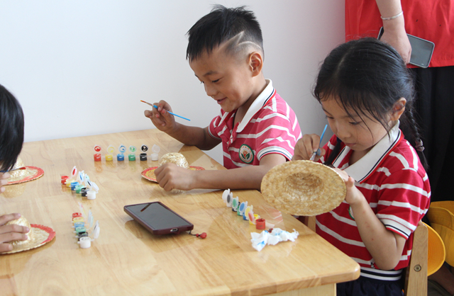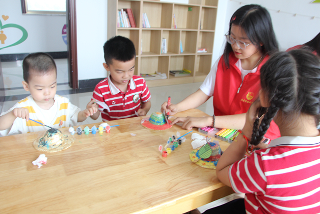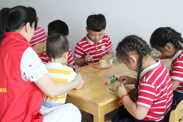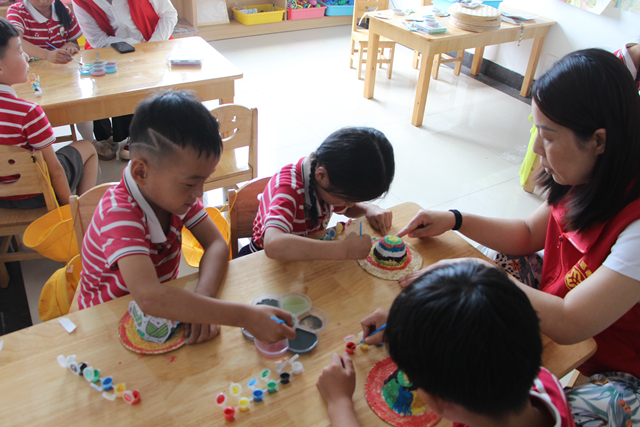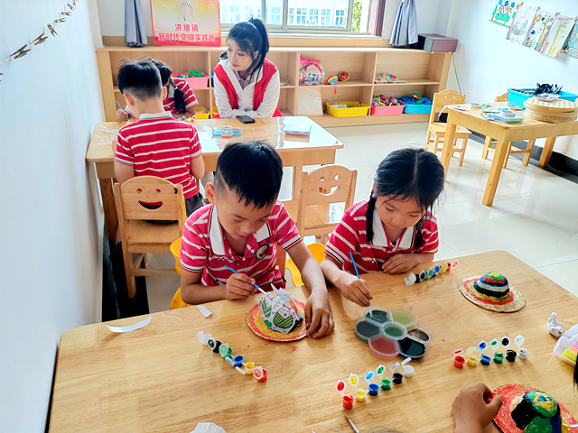 活动开始,志愿者通过视频、图片的形式,为孩子们普及端午节的来历和民俗风情,讲述爱国诗人屈原的故事,让幼儿了解吃粽子、赛龙舟、挂香囊、戴五彩绳等端午节的独特风俗,激发孩子们对传统文化的热爱。在草帽上绘画,是一种什么样的体验?志愿者将草帽、颜料、画笔等材料分发给孩子,孩子们拿起画笔开始进行DIY草帽创作。孩子们迫不及待地根据自己的喜好,充分发挥想象,选择各种颜色在草帽上进行涂色,描绘出彩虹、粽子、花朵等图案;同时,孩子们在志愿者的指导下画出龙舟、粽子等装饰图案,粘贴在草帽上,一顶顶漂亮的有个性的帽子在小朋友们的手中产生了。孩子们纷纷展示自己的创意作品,笑容满满,漂亮的草帽和萌娃们的笑脸相映成趣。