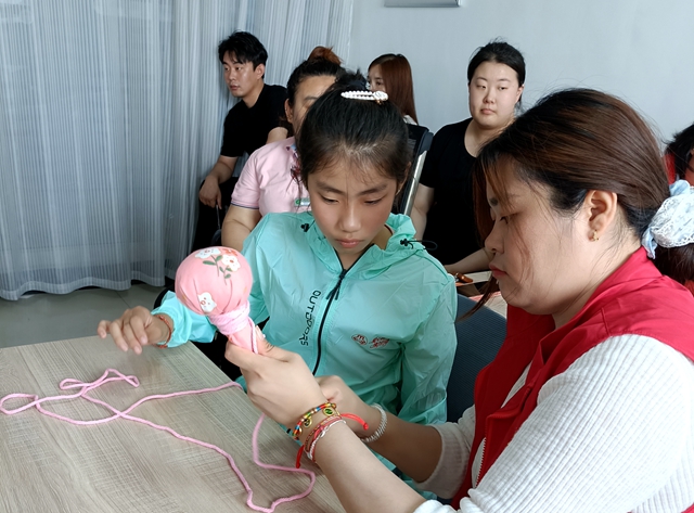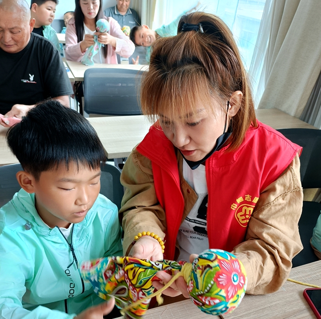 随后,社工们化身“非遗小导师”,向孩子们细致讲解制作艾草锤的每个步骤。孩子们专注投入,将一片片散发清香的艾草化作小巧精致的锤子,在一针一线间感受传统手工艺的独特魅力。