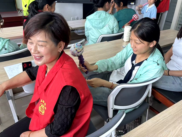 制作过程中,洪绪镇妇联的“爱心妈妈”们全程陪伴,耐心协助孩子们完成作品,现场洋溢着温馨欢乐的氛围。而最令人动容的是,孩子们完成艾草锤后,纷纷用新做好的艾草锤轻轻为妈妈们捶背。这一暖心举动,让在场的每个人都感受到爱与感恩的双向流动。