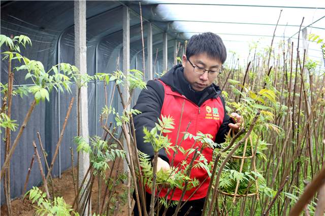 2月29日,在龙阳镇糜庄村红油香椿种植大棚内,一排排香椿郁郁葱葱、长势喜人,一簇簇鲜嫩透亮的香椿芽随风摇曳,阵阵清香扑鼻而来,身穿红马甲的志愿者正在香椿树间穿梭忙碌,帮助农户采摘香椿芽。