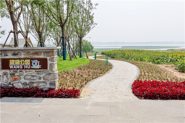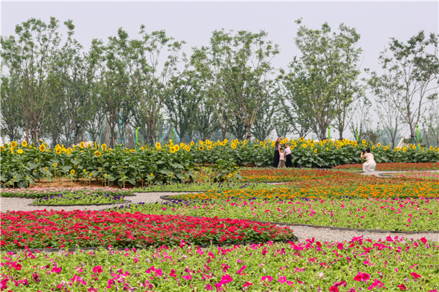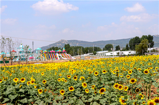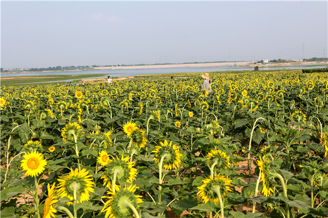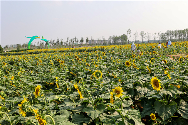 在山东省枣庄市滕州市龙阳镇焦庄村望湖公园,漫山遍野的向日葵迎着阳光怒放,形成了一片壮观的花海,在阳光下熠熠生辉,金黄一片,宛若金色海洋,错落起伏的向日葵一个个精神饱满,仿佛在向游客们挥手致意,邀请他们前来参观、打卡。