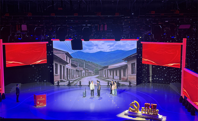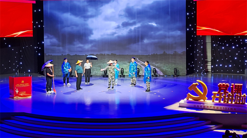 《振兴》以龙阳镇近年来党建引领乡村振兴的真实案例为蓝本,通过“情景再现+现场讲述”的创新形式,将镜头对准田间地头、项目现场和百姓家中,全景展现党建引领下村庄由贫瘠乡村到生机沃野的蝶变轨迹。党课中,党员干部带领群众合力攻坚的奋斗历程、老党员对传统村庄的执着守护、青年人回乡奋斗的生动场景,通过沉浸式舞台呈现,让观众直观感受到“组织强则乡村兴”的深刻内涵。