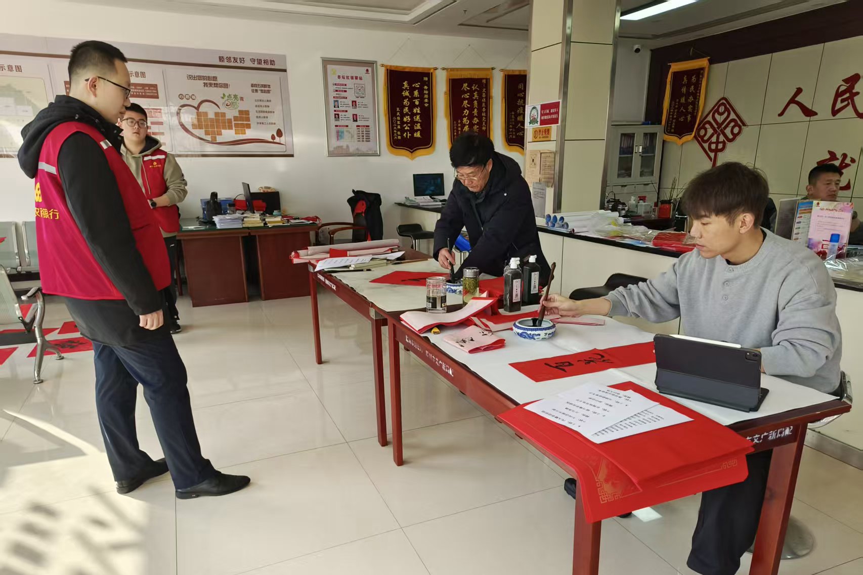 活动现场,春联红纸整齐铺展,墨香飘溢。书法爱好者们蘸墨、运笔一气呵成,笔尖游走间,一副副寓意吉祥的春联接连完成,一个个大红“福”字跃然纸上,红纸黑字间饱含着对新春的期盼与对居民的美好祝愿。拿到心仪春联的居民们喜笑颜开,有的迫不及待地将“福”字展开欣赏,有的互相分享着春联中的美好寓意,现场欢声笑语不断,邻里间的情谊在墨香中悄然升温。